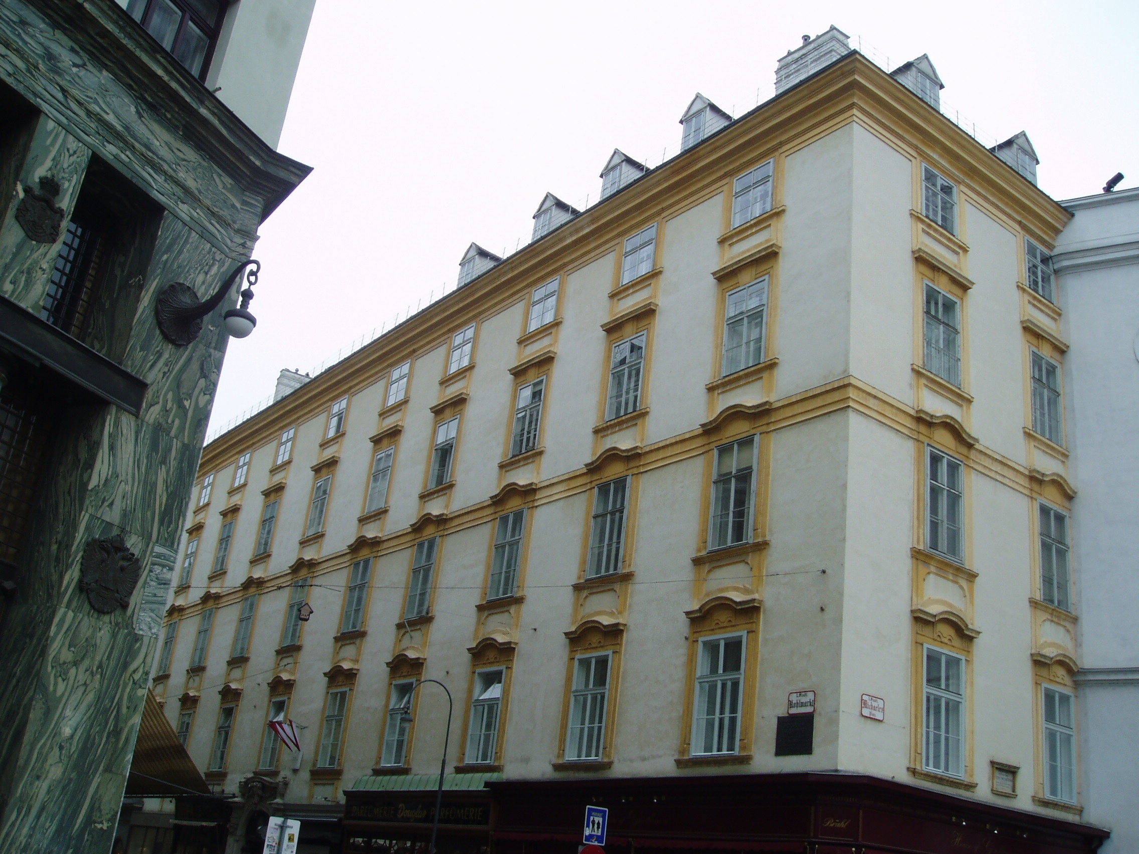 Nyilvános 1495 | 2336 | Kohlmarkt 11.Grosses Michaelerhaus | A "nagy" Szent Mihály-ház Bécs belvárosában, a Burghoz közel, a Szent Mihály templom (lásd: Michaelerplatz 1.) tőszomszédságában áll. Belső udvarán középkori összevisszaságban tapadnak egymáshoz és a szomszédos templom falához a kisebb-nagyobb toldaléképületek. Ebben a házban lakott 1750 és 1757 között a fiatal Joseph Haydn. Nyimorúságos padlásszobácskája volt itt, fűteni nem lehetett, s a rossz tetőszerkezeten át gyakran beesett hozzá az eső. Ekkoriban a szomszédos templom orgonistájaként működött. Vele egyidőben ugyanebben a házban lakott Pietro Metastasio, az udvari költő, és Nicola Porpora, a kitűnő muzsikus, énektanár. |