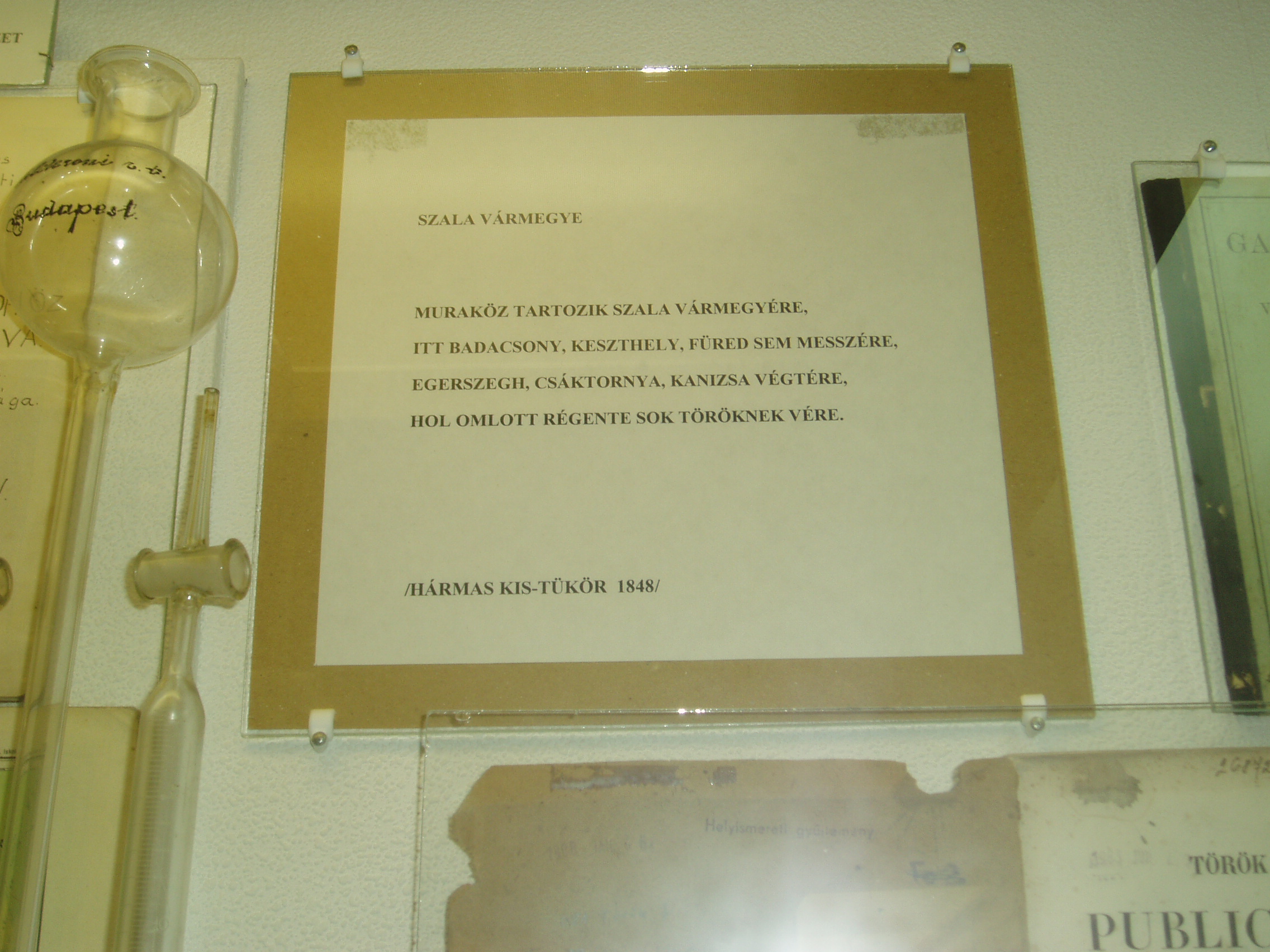 Nyilvános 921 | 1600 | Tapolca: Templom domb 8. Múzeum | A múzeum épülete, az ún. Kántorház - a város védett építészeti emléke - Tapolca történelmi városközpontjában, a Malom-tó fölötti Templom dombon található. Ide járt elemi iskolába a város nagy szülötte, Batsányi János költő. Az épületben 1733-tól 1884-ig folyt az elemi iskolai oktatás. A múzeum iskolatörténeti kiállításán olvasható idézet, Zala vármegye verses összefoglalása a Hármas kis-tükör c. 1848-as tankönyvből. A felvétel 2007 februárjában készült. Felh. irod.: Látnivalók Veszprém megyében. Miskolc, Well-PRess, 2000 Hangodi László: Múltbanéző - kiállításvezető a Tapolcai Városi Múzeum tárlataihoz. Tapolca, 2006 |