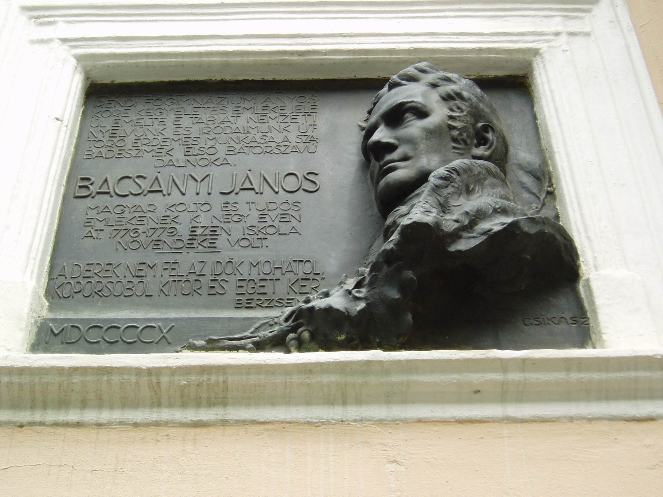Nyilvános 1424 | 2121 | Veszprém, Vár utca 8. | A mai Közgazdasági Szakközépiskolában egykor a nagymúltú piarista gimnázium működött. Itt tanult a tapolcai születésű Batsányi János. Domborműves emléktábláján talán a legszebb róla készült portré látható. A felvétel 2005 augusztusában készült. |