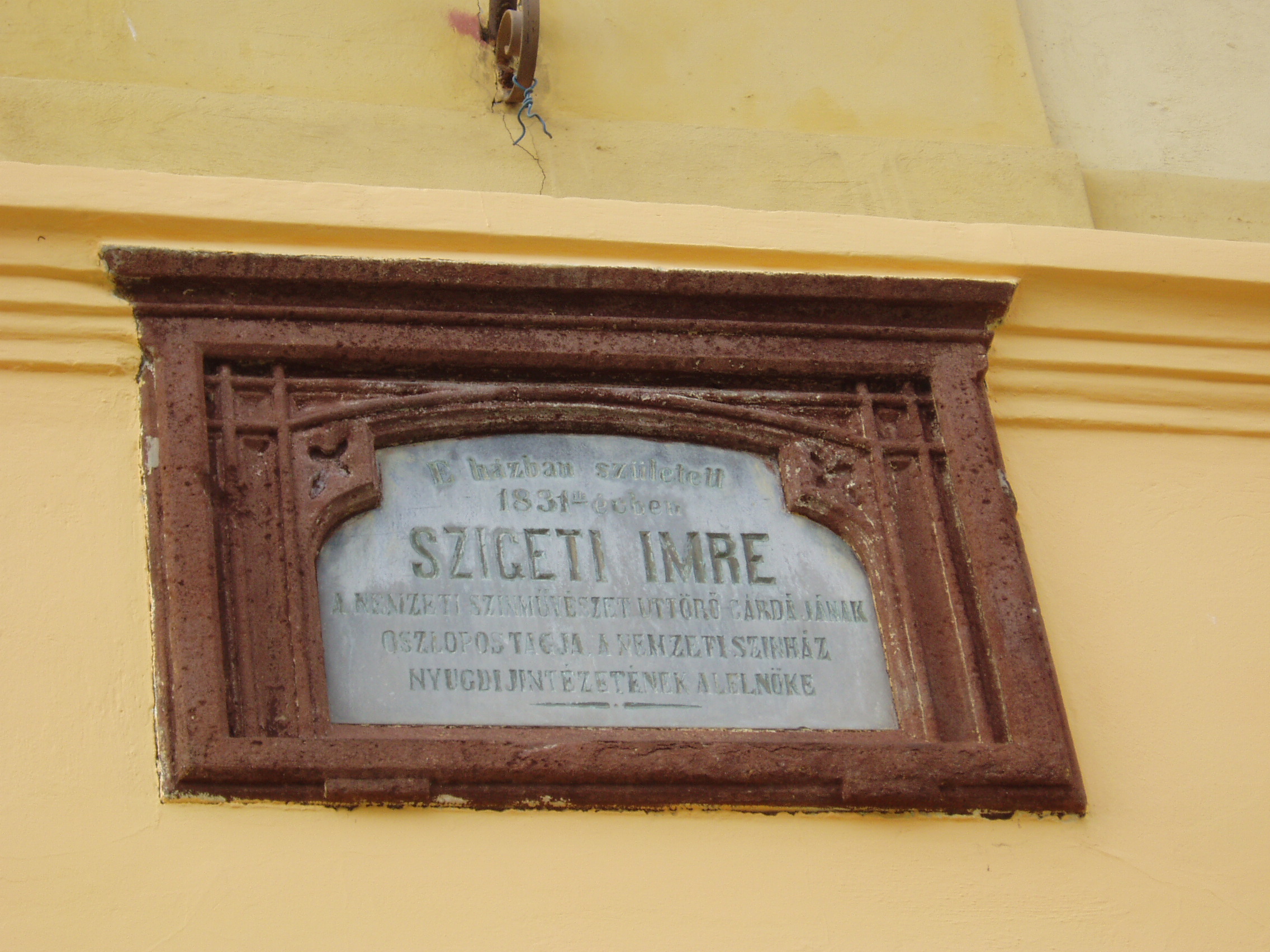 Nyilvános 1437 | 2307 | Veszprém: Kossuth utca 13. | A Kossuth utca Veszprém belvárosának kereskedelmi főutcája. A 13. számú historizáló épületen emléktábla hirdeti, hogy 1831-ben itt született Szigeti Imre (1831-1902) színész. 1856-ban Pécsett lépett először színpadra. Egy év múlva a kolozsvári színházhoz szegődött, 1860-tól pedig a győri színház igazgatója. Közel nyolc évig járt társulatával vidéki városokban, köztük Pápán is. 1868-ban a Nemzeti Színház szerződtette. A nemzeti színházművészet úttörő gárdájának egyik vezető tagja, a Nemzeti Színház nyugdíjintézetének több évig alelnöke volt. Jellemszínészként főként humoros alakokat elevenített meg. A felvétel 2005 augusztusában készült. Felh. irod.: Veszprém megyei életrajzi lexikon. Veszprém, Veszprém Megyei Önkormányzat Közgyűlése, 1998 |