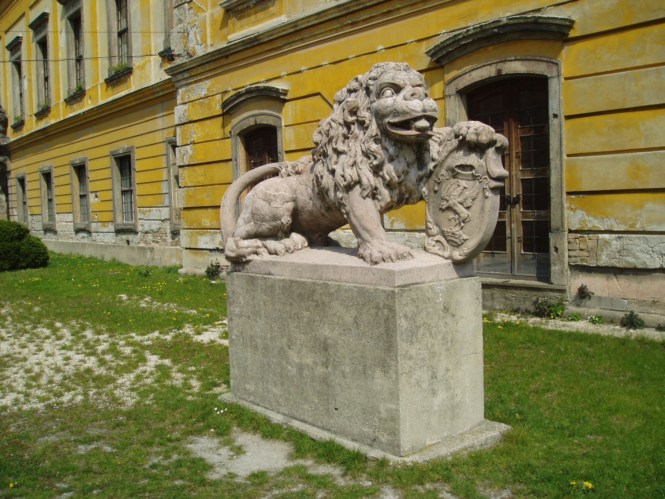Nyilvános 1497 | 2461 | Pápa, Fő tér 1-3. Esterházy-kastély | A barokk kastély a korábban itt állott végvár helyére épült, részben annak alapfalai, kövei felhasználásával. A régi várat az 1740-es évektől Esterházy Ferenc (1683–1754) tárnokmester kezdte átalakítani Franz Anton Pilgram tervei alapján. A barokk várkastély kialakítása 1784-re fejeződött be Esterházy Ferenc fia, Eszterházy Károly egri püspök idejében Fellner Jakab, majd Grossmann József vezetésével. Az U alakú, egyemeletes épület a versailles-i palota nyomán elterjedt francia kastélytípus képviselője. A képen a díszudvar bejáratánál elhelyezett két kőoroszlán egyike látható, amely az Esterházyak címerpajzsát tartja. Az oroszlánok 1945-ig a kastélyt övező kerítés díszes kovácsoltvas kapuját őrizték. A fénykép 2007 áprilisában készült. Felh. irod.: Németh Adél - Szabó Lajos: Pápa. Bp. Panoráma, 1989 Pápa. Szerk. Sz. Farkas Aranka. Bp., Magyar Képek, 2000 |