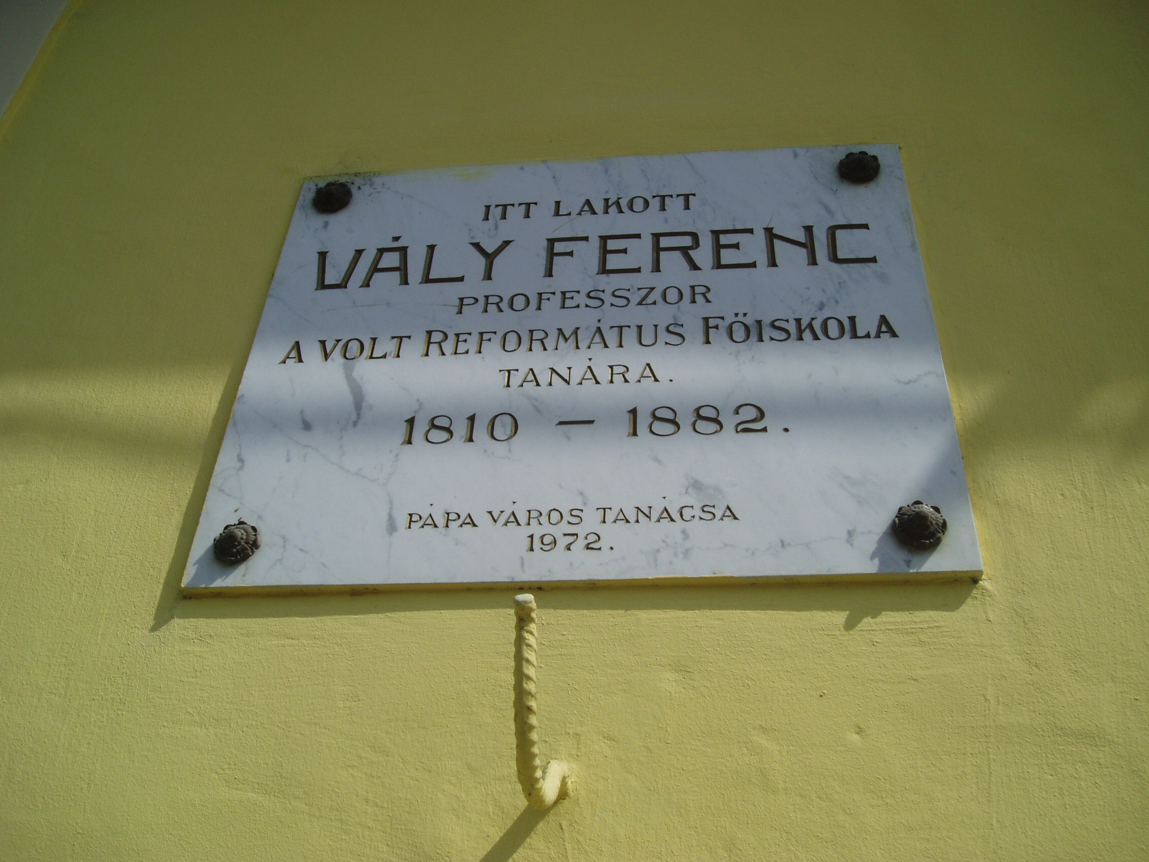 Nyilvános 924 | 1506 | Pápa, Jókai utca 20. | Ez a kis ház volt Vály Ferenc főiskolai professzor lakóháza pápai évei alatt. Vály Ferenc (Magyarsiófok, 1810. szept. 30. – Pápa, 1882. dec. 13.) tanár, tankönyvíró. 1833-tól néhány évig tanító volt Pápán, de visszakerült Komáromba, ahol 1839-től a református gimnázium igazgatójaként működött. 1839-ben feleségül vette Jókay Esztert, Jókai Mór nővérét. A szabadságharc után, melyben tüzérként vett részt, telepedett le a család Pápán, ahol a református főiskola tanára és a tanítóképző igazgatója volt. Egy természetrajzi és egy kémiai tankönyve jelent meg. 1882-ben hunyt el, a pápai Alsóvárosi temetőben nyugszik (lásd: Pápa, Alsóvárosi temető: Vály Ferenc sírja). Felesége, Jókay Eszter 1816-ban született Komáromban. Számos cikket és visszaemlékezést írt a korabeli folyóiratokba, többek között forrásértékű adatokkal szolgált Jókai Mór gyermekkoráról. 1889. máj. 7-én hunyt el Pápán, férjével közös sírban nyugszik. Leányuk, az ebben a házban (is) nevelkedett Vály Mari Komáromban született 1840. nov. 17.-én. Férjének és gyermekének korai halála után Jókaiékhoz költözött a fővárosba, háztartásuk vezetésében segédkezett. Nagybátyja életét terjedelmes emlékiratban örökítette meg. Pápán hunyt el 1915. május 17-én, sírja szülei nyughelye mellett van (lásd: Pápa, Alsóvárosi temető: Vály Mari sírja). A fénykép 2007 áprilisában készült. Felh. irod.: Németh Adél - Szabó Lajos: Pápa. Bp. Panoráma, 1989 Veszprém megyei életrajzi lexikon. Veszprém, Veszprém Megyei Önkormányzat Közgyűlése, 1998 |