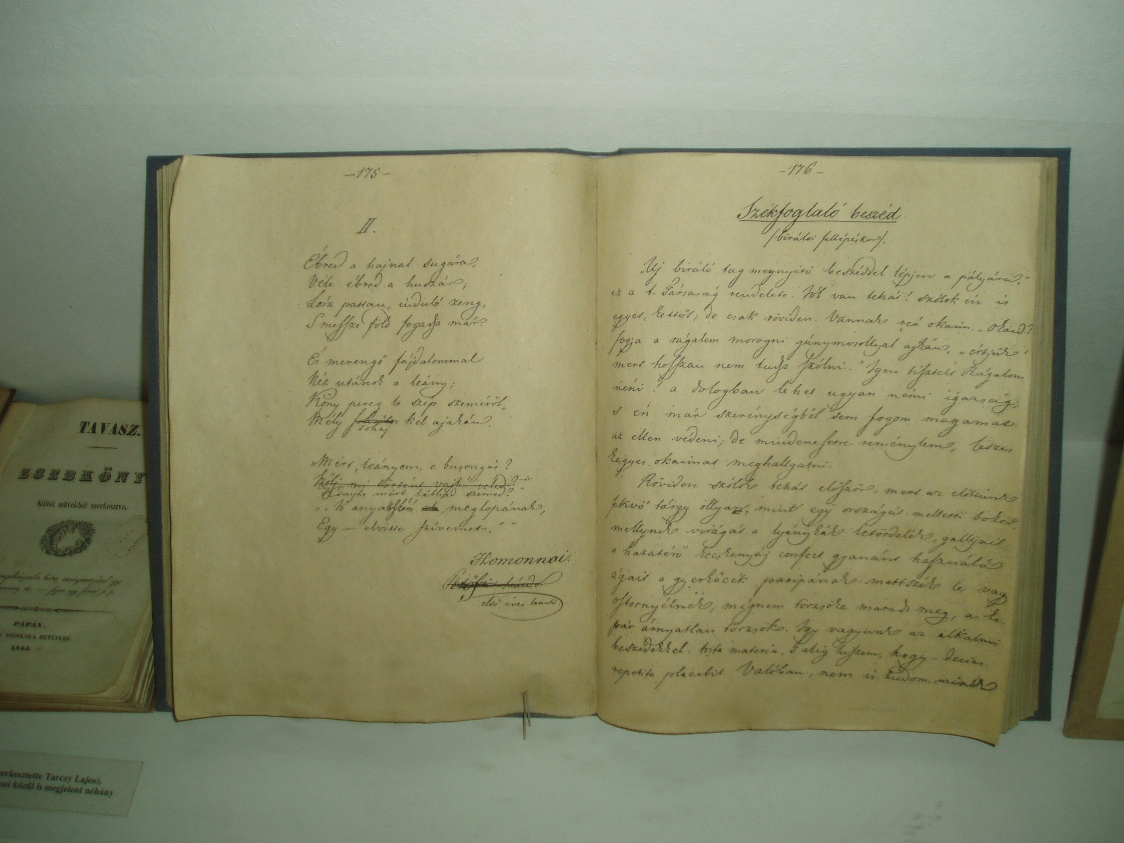 Nyilvános 1415 | 2193 | Pápa, Március 15. tér 9. Pápai Református Kollégium Gimnáziuma | A híres pápai Református Kollégium első épülete 1531 és 1752 között a mai Ruszek közben, a Lábasház épületének helyén állott. 1752-ben - Mária Terézia rendeletének következtében, amely megszüntette a szabad vallásgyakorlást - harminckét évig csak a közeli Adásztevelen működhetett. 1784-ben, II. József türelmi rendeletének köszönhetően térhetett vissza az iskola Pápára, s hamarosan felépült a ma Ókollégiumként ismert épület (lásd: Pápa, Petőfi u. 13.), amelyben 1794-ben indulhatott meg az oktatás. Az intézmény 1857-ig működött ott, ekkor átköltözött a Március 15. tér 13-15. számú házba, az ún. Nátus-ba, majd 1895-ben utolsó végleles helyére, ide, a Március 15. tér 9. számú monumentális új épületbe. Az intézmény könyvtárának előterében kis kiállítás idézi a Kollégium múltját. Egy tárlóban látható a Képzőtársaság Érdemkönyvének másolata (az eredeti példány is megvan a könyvtár kincsei között). A Képzőtársaság voltaképpen a Kollégium önképzőköre volt, amelyet Tarczy Lajos tanár alapított meg 1841-ben. Tagjai között ott volt Petőfi Sándor, Jókai Mór és Orlai Petrich Soma (abban az időben mindannyian a Kollégium diákjai voltak - lásd: Pápa, Petőfi u. 13.). A Képzőtársaság a város egyik legjelentősebb szellemi központja lett és 110 évig, a Kollégium államosításáig állt fenn. Az érdemkönyvbe a legjobbnak ítélt alkotásokat szerzőik, a diákok saját kezükkel írhatták be. A nyitott oldalon Petőfi Székfoglaló beszéde olvasható, amelyet akkor írt, amikor beválasztották a Képzőtársaság bírálóinak sorába. A fénykép 2007 áprilisában készült. Felh. irod.: Németh Adél - Szabó Lajos: Pápa. Bp. Panoráma, 1989 http://refi-papa.hu http://hu.wikipedia.org/wiki |
