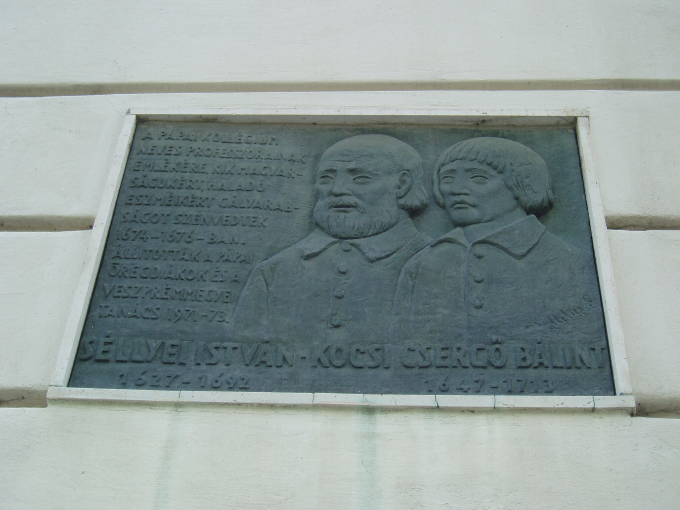 Nyilvános 1378 | 2111 | Pápa, Március 15. tér 9. Pápai Református Kollégium Gimnáziuma | A híres pápai Református Kollégium első épülete 1531 és 1752 között a mai Ruszek közben, a Lábasház épületének helyén állott. 1752-ben - Mária Terézia rendeletének következtében, amely megszüntette a szabad vallásgyakorlást - harminckét évig csak a közeli Adásztevelen működhetett. 1784-ben, II. József türelmi rendeletének köszönhetően térhetett vissza az iskola Pápára, s hamarosan felépült a ma Ókollégiumként ismert épület (lásd: Pápa, Petőfi u. 13.), amelyben 1794-ben indulhatott meg az oktatás. Az intézmény 1857-ig működött ott, ekkor átköltözött a Március 15. tér 13-15. számú házba, az ún. Nátus-ba, majd 1895-ben utolsó végleles helyére, ide, a Március 15. tér 9. számú monumentális új épületbe. A képen látható dombormű Séllyei István (1669-1692) gályarab prédikátor, dunántúli püspök, valamint Kocsi Csergő Bálint (1647-1711), szintén gályarabságra ítélt író, lelkész, tanár emlékét őrzi. Miután Ruyter holland tengernagy segítségével (lásd még: Debrecen, Emlékkert: Gálayarabok emlékoszlopa) kiszabadultak még életben lévő társaikkal együtt, hazatérve fellendítették az iskolát. Az emléktábla Mikus Sándor alkotása. A fénykép 2007 áprilisában készült. Felh. irod.: Németh Adél - Szabó Lajos: Pápa. Bp. Panoráma, 1989 http://refi-papa.hu |