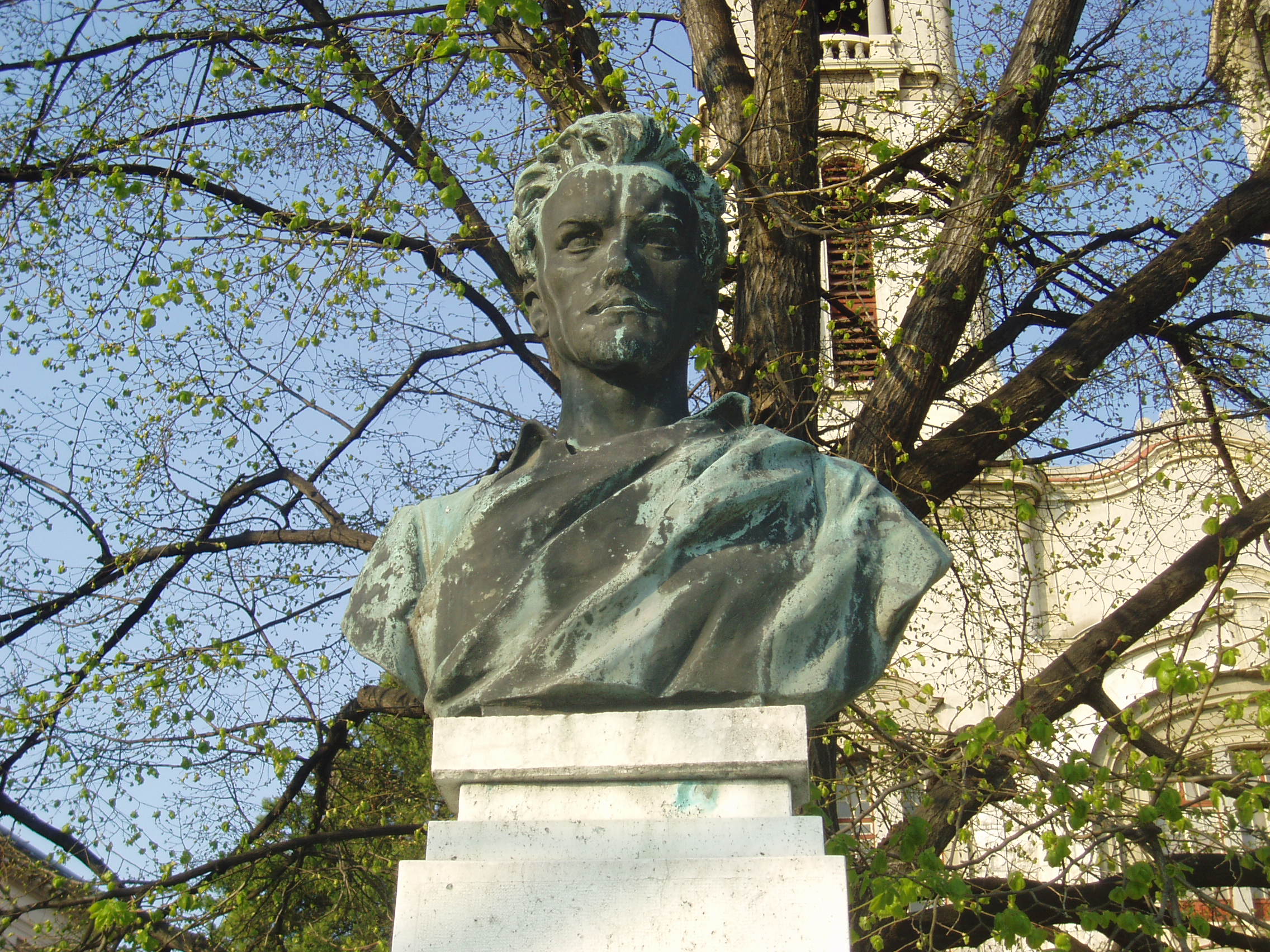 Nyilvános 957 | 2388 | Pápa, Március 15. tér: Jókai Mór mellszobra | A Honvéd emlékművet (lásd: Pápa, Március 15. tér. Honvéd emlékmű) Petőfi Sándor és Jókai Mór oszlopon nyugvó mellszobra fogja közre. Mindketten a pápai kollégium (lásd: Pápa, Petőfi u. 13.) diákjai voltak 1841/42-ben. A szobrok alkotója Kisfaludy Strobl Zsigmond. Megvalósításukban a pápai Jókai Körnek volt komoly szerepe, felállításukat még 1898-ban kezdeményezték. Végül 1931-ben sikerült csak felavatni őket a református főiskola 400 éves jubielumán, az ünnepségen részt vevő Horthy Miklós kormányzó jelenlétében. Petőfi mellszobrának talapzatán a költő Pápán írt egyik versének idézete olvasható: "A kürtkebelbe fú Lehel s a kürt riadva énekel". A fénykép 2007 áprilisában készült. Felh. irod.: Németh Adél - Szabó József: Pápa. Bp. Panoráma, 1989 |