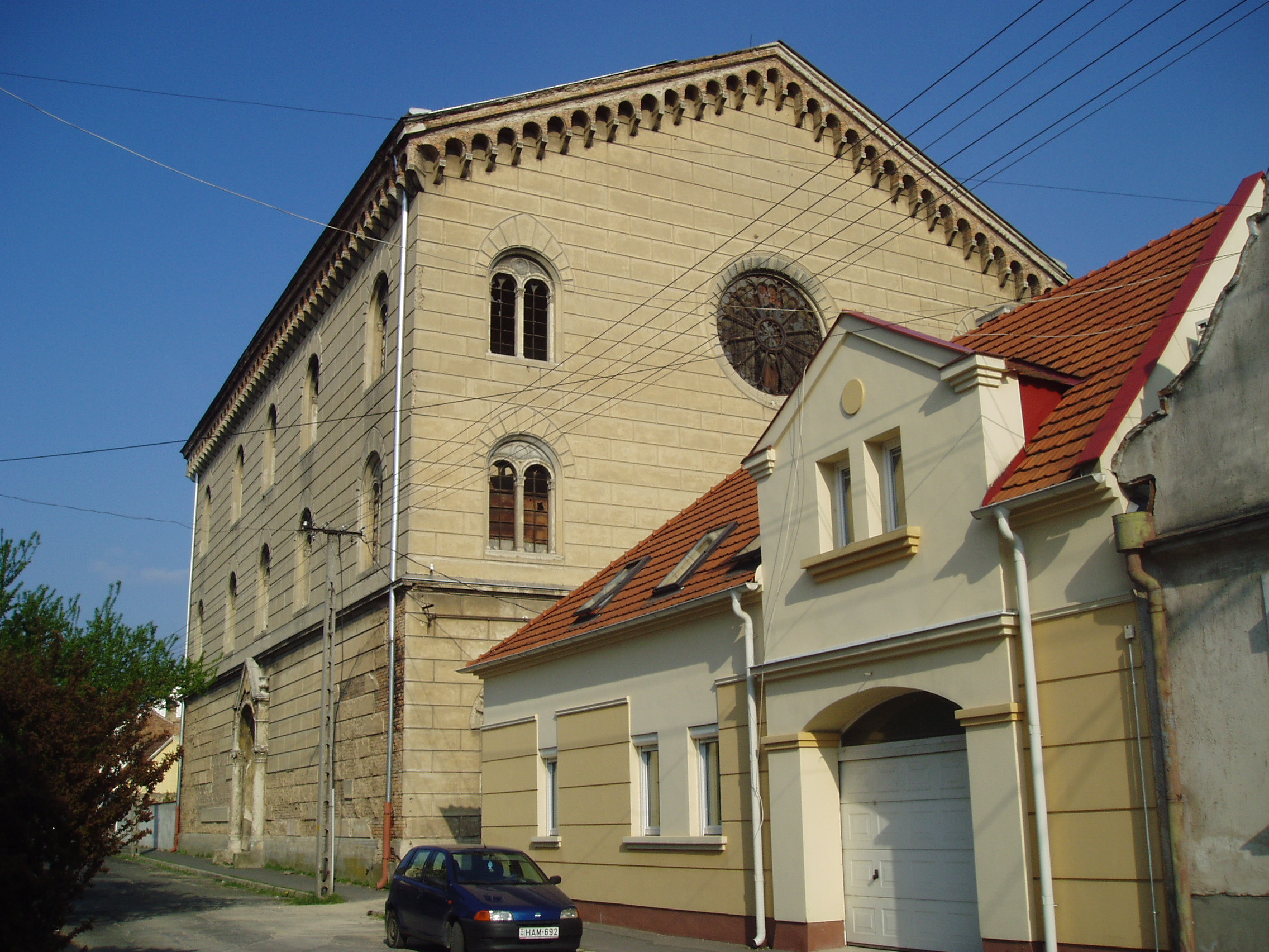 Nyilvános 1443 | 3314 | Pápa, Petőfi utca 21. Zsinagóga | A napjainkig eredeti formában fennmaradt zsinagóga építését 1844-ben kezdték el. A 398 m2 alapterületű, közel 20 méter magas épületet Löw Lipót rabbi szentelte fel 1846-ban. A főbejárat a vallási előírásoknak megfelelően a nyugati oldalon található. A zsinagóga puritán külső megjelenését csak a félköríves fülkékbe helyezett romantikus ikerablakok és a klasszicizáló oldalkijárat díszíti. A kétszintes karzatszerkezettel rendelkező, dekoratívan festett belső térben nyolcszáz férfi számára volt ülőhely. Az épület jelenleg (2007) rendkívül elhanyagolt állapotban van, felújításra vár. A fénykép 2007 áprilisában készült. Felh. irod.: Németh Adél - Szabó Lajos: Pápa. Bp. Panoráma, 1989 www.papa.hu |