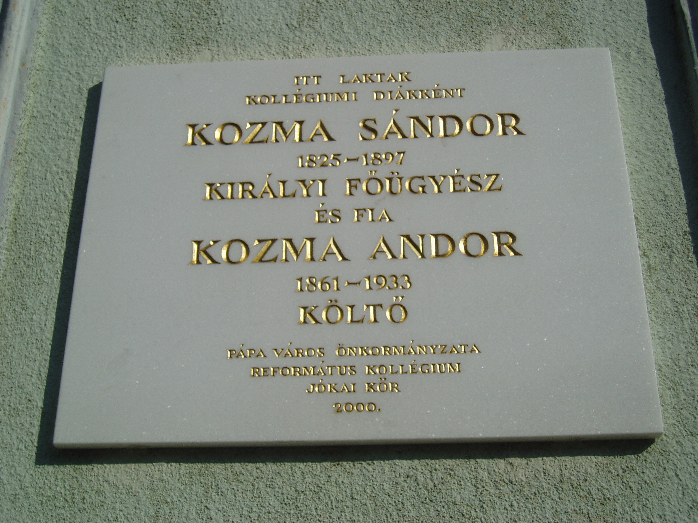 Nyilvános 1424 | 1987 | Pápa, Széchenyi utca 10. | A városi lakóház többszörös kultúrtörténeti jelentőséggel bír. Itt, a ház utcafronti részében lakott Bocsor István (1807-1885), a pápai református kollégium (lásd: Pápa, Petőfi u. 13.) egyik nagy tanáregyénisége. Emléktábláját 1972-ben avatták fel (lásd: Pápa, Széchenyi u. 10. 2.kép). Egy másik emléktáblán Kozma Sándor (1825-1897), későbbi királyi főügyész (Bocsor ifjú sógora) és fia, Kozma Andor (1861-1933) költő neve olvasható. Mindketten itt laktak pápai diákéveik idején. Kozma Andor még verset is írt Bocsor Istvánról "Karthagói harangok" címmel (lásd: Pápa, Széchenyi u. 10. 2.kép). Apja, Kozma Sándor, aki Pápáról Leveldi néven színházi kritikákat írt a Regélőbe, Petőfi egyik jóbarátja volt közös pápai diákságuk idején. Akkor barátkoztak össze, amikor Petőfit, Kozmát és még három társukat a matematikaórák hanyagolása miatt egy egész napra a karcerba zárták. Itt, Petőfi vezérletével azzal mulatták az időt, hogy alkalmi színdarabot rögtönöztek Az öt jómadár címmel, melynek "színlapját" felvésték a karcer falára. Emléktábla még nem jelzi, de Petőfi Sándor is lakott a házban, itt volt negyedik pápai szállása 1843 tavaszán. Hat hétig időzött ekkor a városban; ekkor, áprilisban írta Barátimhoz c. versét: Nos, fiúk, nem szólt a szarka Házfödélteken? Vagy ki álmodá meg, hogy ma Vendégtek leszen? De mi a kő! mért e hosszu Méla bámulás? H'sz én vagyok, ha nem csalódom, Én és senki más. Vagy feledve már talán a Régi jóbarát? Nem hihetem, hogy reátok Illenék e vád. A szövetség, melynek szála Minket összefont, Áll, amíg csak vért bir a szív És velőt a csont. No de kissé meglepett tán Jöttöm úgyebár? Hja, öcséim, velem a sors Furcsa táncot jár. Köztem s közte folyton-folyva Tart a háború, S majd lenyom, majd, mint a pelyhet, Végtelenbe fú. De azért nem csüggedünk ám, Aki lelke van! Szembeszállok őkelmével Bátran, szilajan. S tán ha látja sors komám, hogy Csüggedés nem ért: Egykor annál bőkezűbben Nyujtja majd a bért... Eh, de mit most okoskodni! Csapjatok kezet; Jóbarát markába csapni Kedves élvezet. S mely bennünket ily váratlan Együvé hozott, Áldomással ünnepeljük A pompás napot! Petőfi ebből a házból indult május közepén, miután felkérést kapott Nagy Ignáctól egy francia regény fordítására, zuhogó esőben, gyalogosan Pozsonyba. Szobatársa, Puzdor Gyula elkísérte a Kálváriáig, ahol - Petőfi minden vonakodása ellenére - nyakába akasztotta gallérköpönyegét. Ez volt Petőfi utolsó pápai látogatása. A fénykép 2007 áprilisában készült. Felh. irod.: Petőfi emlékhelyek a Kárpát-medencében. Kiskőrös, 1996, Petőfi Sándor Társaság "A kényes úrfi s a rongyos baka". Tanulmányok két halhatatlan pápai diákról. Pápa, 2001, Pápai Református Gyűjtemények |