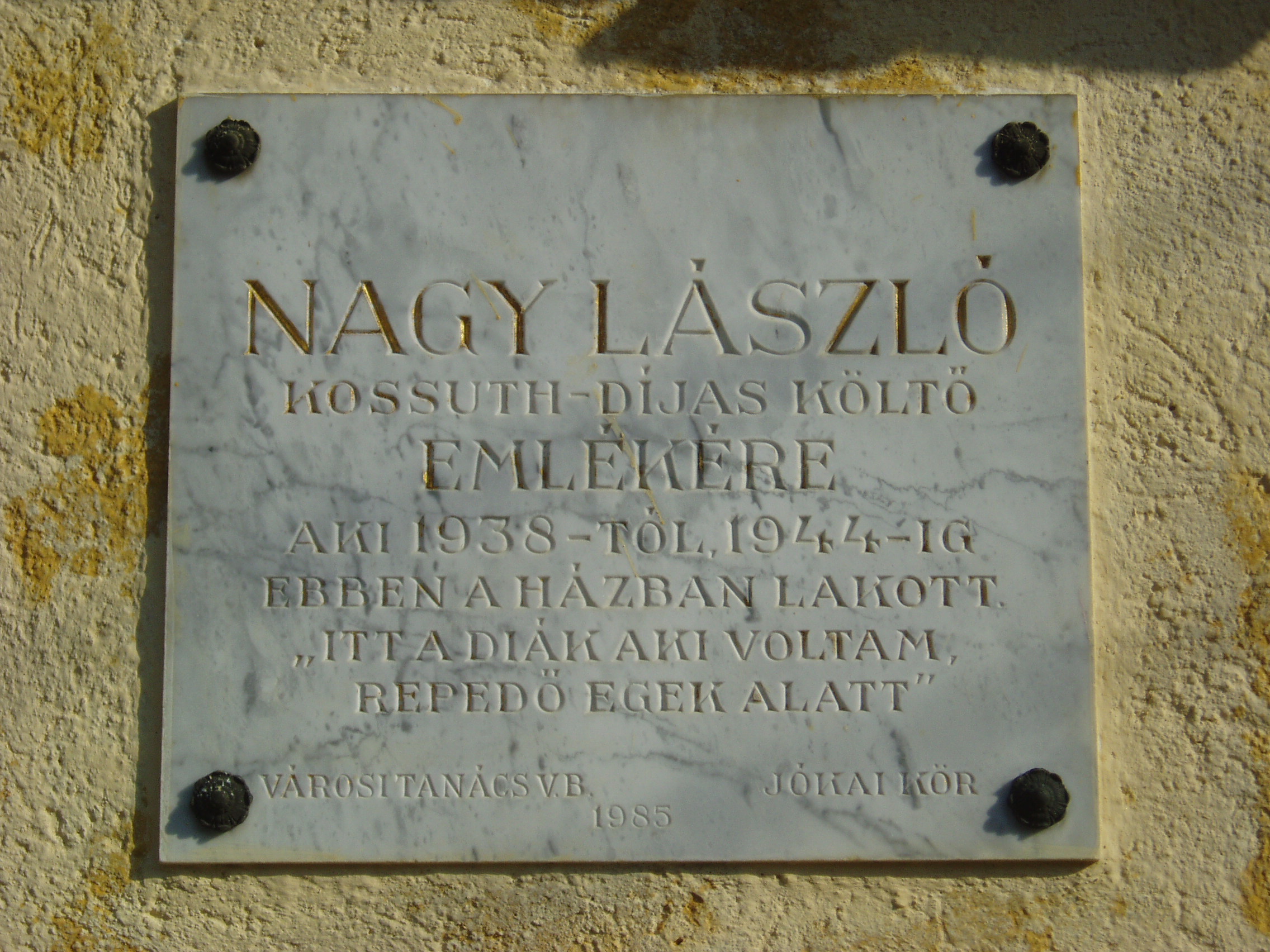 Nyilvános 1378 | 1942 | Pápa, Világos utca 20. | Mint a homlokzaton lévő emléktáblán olvasható, pápai diákévei idején, 1938-1944 között ebben a házban lakott Nagy László (1925-1978) költő. Szülőfalujában, Iszkázon végzett elemi iskolai tanulmányait tíz éves korában, 1935-ben bekövetkező súlyos betegsége két évre félbeszakította, azóta járógéppel járt. 1938 őszétől Pápán tanult tovább. Már nővérei is ott jártak iskolába, s Nagy László is csatlakozott hozzájuk. Anyai nagyanyja felügyelete alatt ebben a házban lakott, testvérei és unokatestvérei körében, nyolcadmagával. A kicsi szobában már nem jutott neki hely, ő a konyhában, azon az asztalból átalakított ágyon feküdt, amelyet jókedvükben meseautónak neveztek el. Balázs Mihály így festi a kamaszfiú pápai mindennapjait, közben a költő egyik testvérét is idézve: "A nagymama akkora fazék káposztákat főzött nekik, hogy három napig is rájártak. Mindig éhesek voltak, megették volna a 'vasszöget is'. Az idősebbik leánytestvér mesélte: 'Nagyon sok mákos és diós kalácsot meg tudtunk volna enni, de mindig elosztva kaptuk. Lackónak a nyárádi lányok egy dolgozatért, rajzcsinálásért odaadták a részüket. Ügyes keze miatt minden plakátot, rajzot ő készített.'" A költő a polgári fiúiskolába, majd 1941 őszétől a kereskedelmi iskolába (lásd: Pápa, Március 15. tér 9.) járt. Iskolaéveit megcsonkította a háború. 1945 júniusában érettségizett le. A házat, amely egyébként nagyon hasonlít arra, amelyik annakidején Petőfinek adott szállást (lásd: Pápa, Petőfi u. 11.), 1985-ben jelölték meg emléktáblával. Rajta a költő egy sora olvasható: "Itt a diák aki voltam, repedő egek alatt". A fénykép 2007 áprilisában készült. Felh. irod.: Balázs Mihály: Szülőföld és iskola. Írók, költők gyermek- és ifjúkora. Bp. Korona Kiadó, 1996 |