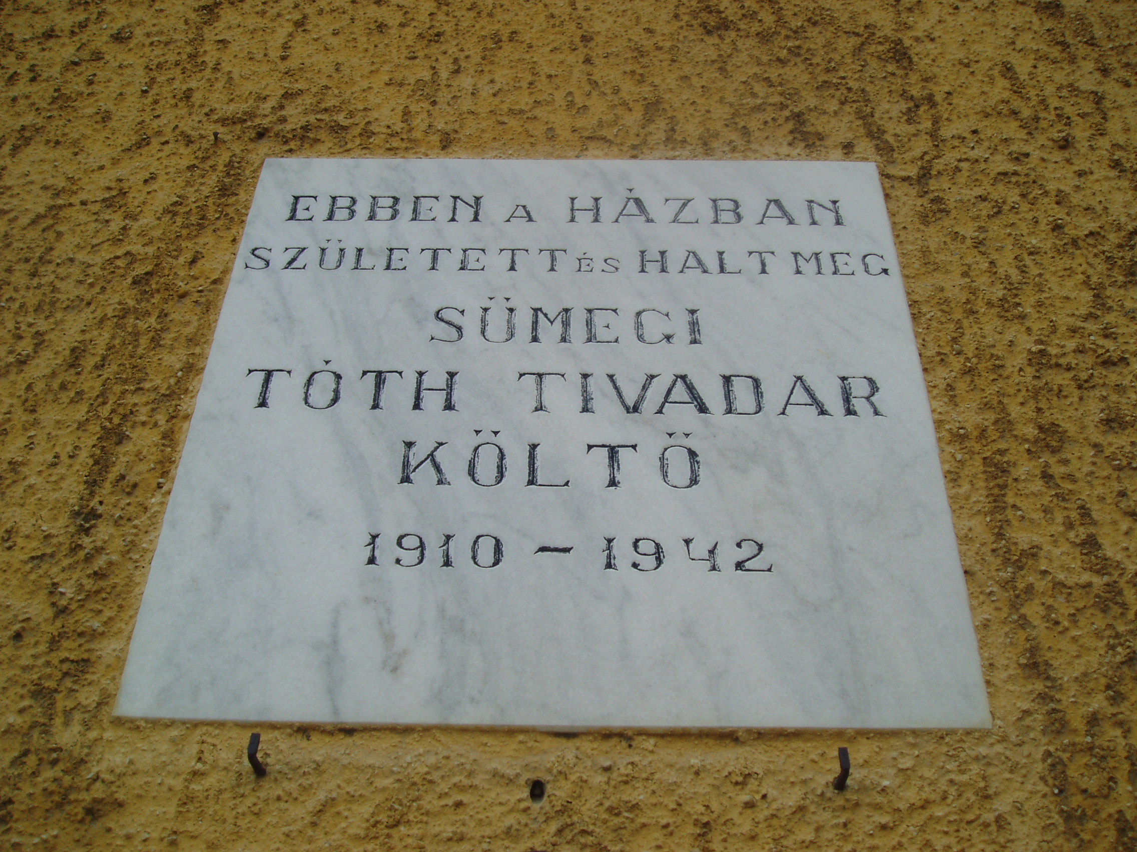 Nyilvános 1407 | 2050 | Sümeg, Cseh L. utca 1. | Mint az épület homlokzatán elhelyezett emléktáblán is olvasható, ebben a házban született és halt meg Sümegi Tóth Tivadar költő. Sümegi Tóth Tivadar (Sümeg, 1910. nov. 19. – Sümeg, 1942. aug. 15.) költő. Középiskola tanulmányok után sok mindennel próbálkozott, sokáig Budapesten volt tisztviselő. Hányatott sorsáról népies ízű, fanyar hangulatú versei tanúskodnak. A Magyar Élet és a Kelet Népe közölte költeményeit. Versei terjesztésének különleges módját választotta. Előbb kézírással, majd indigós gépeléssel 5–6 versét adta közre pár oldalas kis füzetekben. Fiatalon, tüdőbajban hunyt el. Verseinek gyűjteményes kötete 1995-ben jelent meg Életért kiáltok címmel a Sümegi írások sorozatban. A sümegi Városi temetőben nyugszik. A városban utca viseli nevét. A fénykép 2007 júniusában készült. Felh. irod.: Veszprém megyei életrajzi lexikon. Veszprém, 1998 |