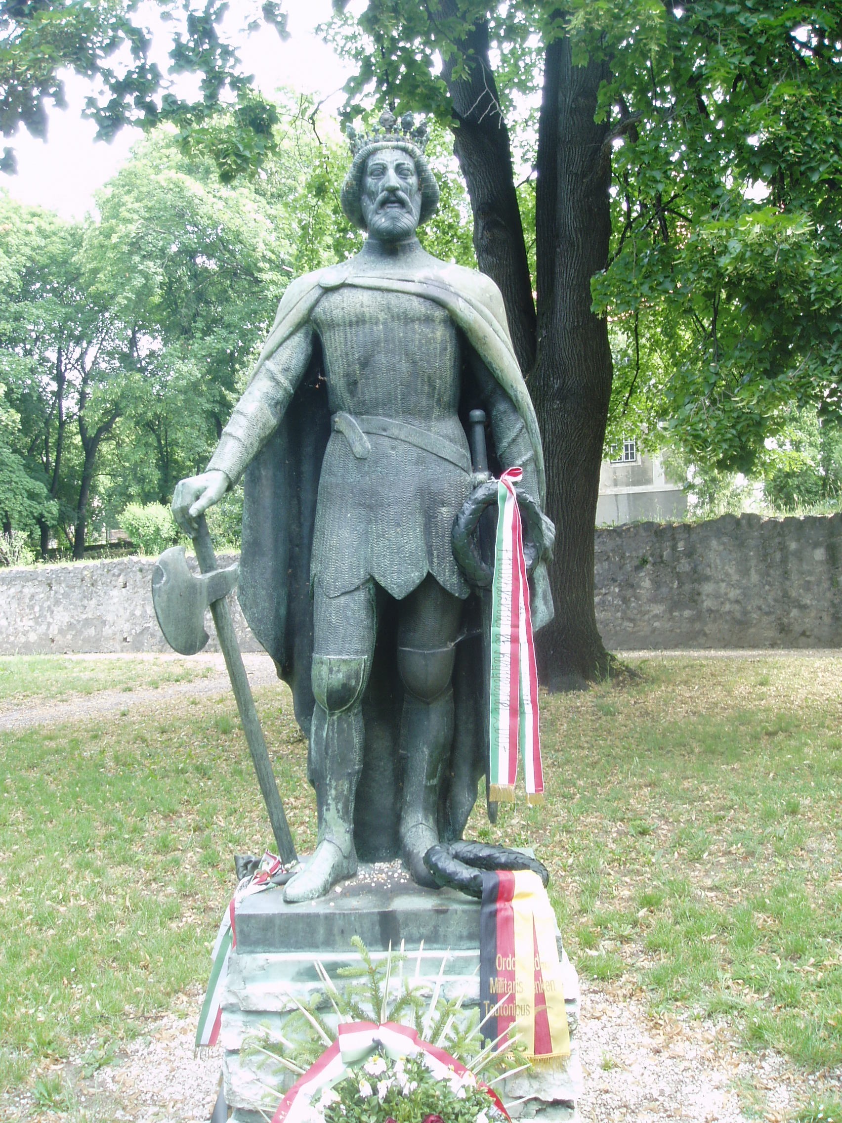 Nyilvános 1391 | 2308 | Sümeg, Népkert: Szent László király szobra | A Püspöki palotától (lásd: Sümeg, Szent István tér 10.) délkeletre terül el a Népkert, amely annakidején a palota díszkertje volt. Itt áll Oláh Sándor Szent László királyt ábrázoló egészalakos szobra. A műalkotást 1990-ben a Honvédelmi Minisztérium és a Hadtörténeti Múzeum ajándékozta Sümeg városának. Érdekesség, hogy 1606-tól 50 éven keresztül a sümegi ferences templomban (lásd: Sümeg, Szent István tér 7.) őrizték a török elől megmentett Szent László-hermát. A fénykép 2007 júniusában készült. Felh. irod.: Koppány Tibor - Kozák Károly: Sümeg útikalauz. Veszprém, Idegenforgalmi Hivatal, 1965 Történeti emlékek Veszprém megyében. = www.ekmk.hu/emlekhely/Emlekhelyek/h_olv.html Látnivalók Veszprém megyében. Miskolc, Well-PRess, 2004 Sümegi kalauz. Sümeg, Sümegi Fórum alapítvány, 1993 |