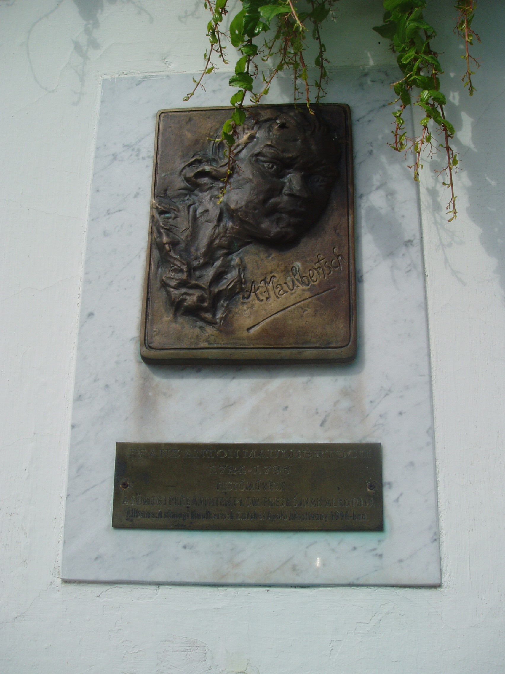 Nyilvános 1374 | 1956 | Sümeg, Panteonfal. Maulbertsch emléktáblája | A Kisfaludy téren, Kisfaludy Sándor szülőháza előtt alakították ki Sümeg Panteonfalát. A képen Franz Anton Maulbertsch emléktáblája látható, Máger Ágnes alkotása (1996). Felirata: FRANZ ANTON MAULBERTSCH, 1724-1796, festőművész. A sümegi plébániatemplom freskóinak alkotója. Franz Anton Maulbertsch (Langenargen, 1724. június 8. - Bécs, 1796. augusztus 7.) festőművész. 1839-től a bécsi Akadémián tanult. Első önálló nagyszabású műve a bécsi Maria Trau piarista templom mennyezetképe (1753). Freskófestészetének jelentős állomása volt Sümeg 1757-58-ban, amikor Padányi Bíró Márton püspök megbízásából megalkotta a sümegi plébániatemplom (lásd: Sümeg, Bíró M. u. 1.) pompás falfestményeit. Maulbertsch sokat dolgozott Magyarországon (Pozsony, Pápa, Győr, Kalocsa, Szombathely, Zirc, Eger). Élete utolsó befejezett munkáját Prágában készítette el, ahol a Strahov kolostor mennyezetét festette ki. 1796-ban Bécsben hunyt el. A fénykép 2007 júniusában készült. Felh. irod.: Koppány Tibor - Kozák Károly: Sümeg útikalauz. Veszprém, Idegenforgalmi Hivatal, 1965 Látnivalók Veszprém megyében. Miskolc, Well-PRess, 2004 Veszprém megyei életrajzi lexikon. Veszprém, Veszprém Megyei Önkormányzat Közgyűlése, 1998 www.ekmk.hu/emlekhely/Emlekhelyek.html |