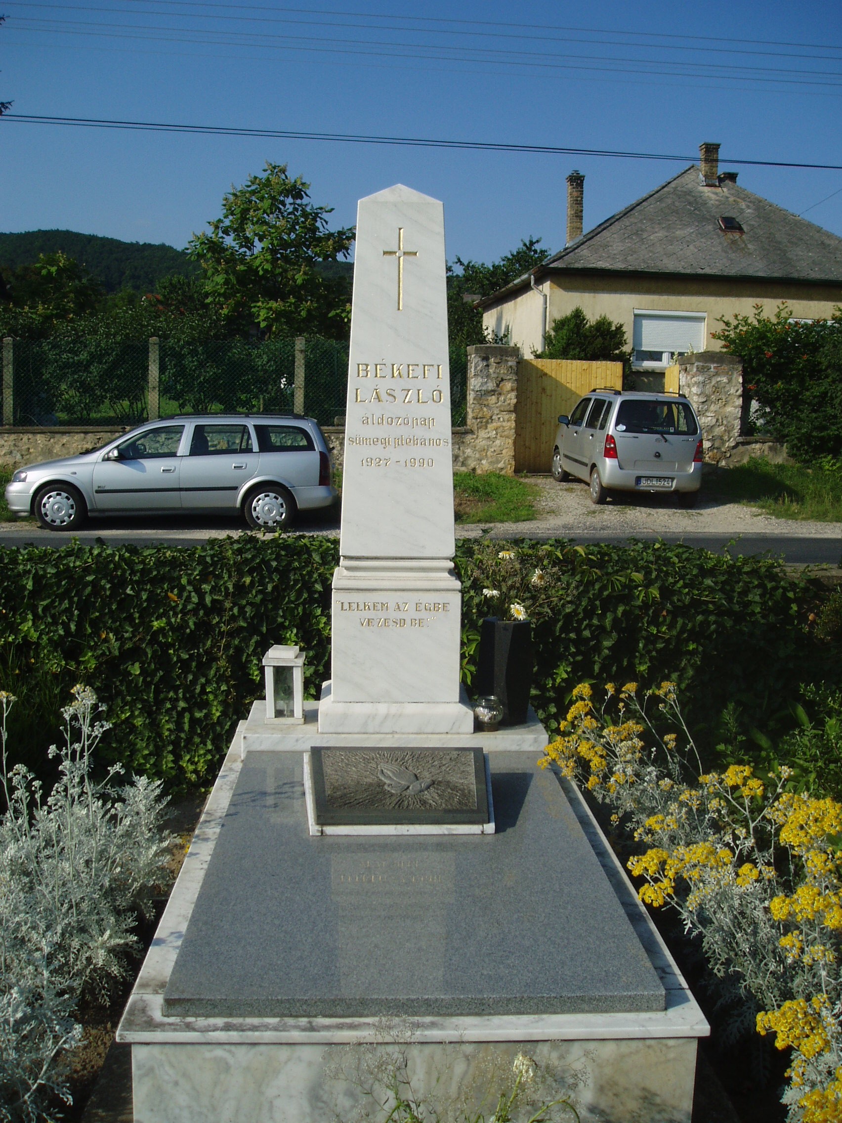 Nyilvános 1380 | 2019 | Sümeg, Temető. Békefi László sírja | Sümeg délkeleti határában, a Tapolcára vezető út mellett emelkedő lankás domboldalon találjuk a város köztemetőjét. Helyét még Bíró Márton püspök jelölte ki; jelentősebb számban a XIX. század eleje óta kezdtek ide temetkezni. A temetődomb tetején áll az 1816-ban épített, későbarokk stílusú temetőkápolna. Körülötte a sümegi élet utolsó két évszázada szinte valamennyi híres személyiségének sírja fellelhető. A képen Békefi László (1927-1990) áldozópap, sümegi plébános, Sümeg díszpolgára sírja látható. A fénykép 2007 júniusában készült. Felh. irod.: Koppány Tibor - Kozák Károly: Sümeg útikalauz. Veszprém, Idegenforgalmi Hivatal, 1965 Sümegi kalauz. Sümeg, Sümegi Fórum Alapítvány, 1993 Miklósi-Sikes Csaba: Kőbe vésett történelem. A sümegi városi temetők története és sírjelei 1950-ig. Sümeg, Sümegi Fórum Alapítvány, 2002 Veszprém megyei életrajzi lexikon. Veszprém, Veszprém Megyei Önkormányzat Közgyűlése, 1998 |