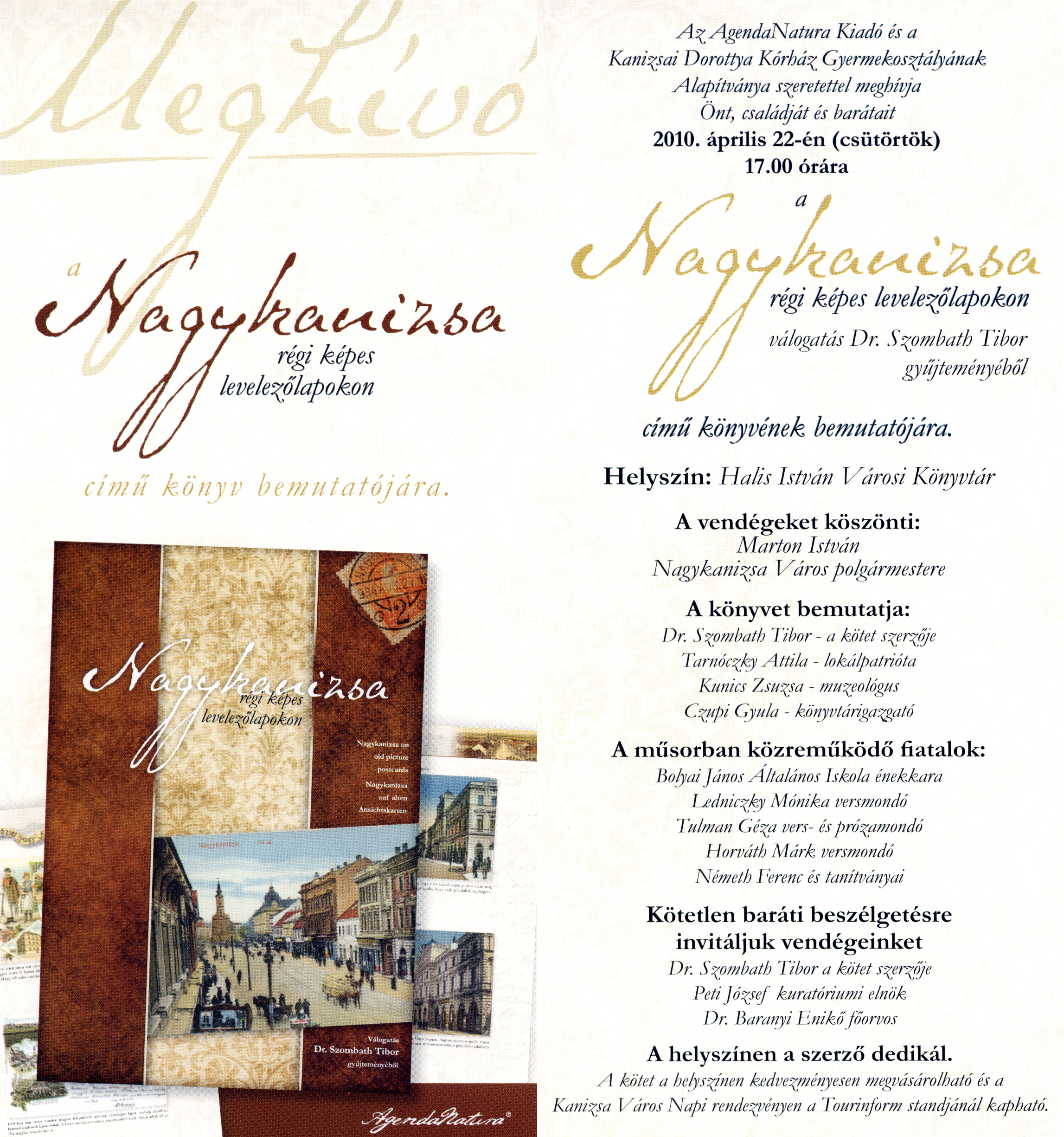Nyilvános 1943 | 5695 | A meghívó szövege: | Az Agenda Natura Kiadó és a Kanizsai Dorottya Kórház Gyermekosztályának Alapítványa szeretettel meghívja Önt, családját és barátait 2010. április 22-én (csütörtök) 17.00 órára a Nagykanizsa régi képes levelezőlapokon válogatás Dr. Szombath Tibor gyűjteményéből című könyvének bemutatójára. Helyszín: Halis István Városi Könyvtár A vendégeket köszönti: Marton István Nagykanizsa Város polgármestere A könyvet bemutatja: Dr. Szpmbath Tibor - a kötet szerzője Tarnóczky Attila - lokálpatrióta Kunics Zsuzsa - muzeológus Czupi Gyula - könyvtárigazgató A műsorban közreműködő fiatalok: Bolyai János Általános Iskola énekkara Ledniczky Mónika versmondó Tulman Géza vers- és prózamondó Horváth Márk versmondó Németh Ferenc és tanítványai Kötetlen baráti beszélgetésre invitáljuk vendégeinket Dr. Szombath Tibor a kötet szerzője Peti József kuratóriumi elnök Dr. Bárányi Enikő főorvos A helyszínen a szerző dedikál. A kötet a helyszínen kedvezményesen megvásárolható és a Kanizsa Város Napi rendezvényen a Tourinform standjánál kapható. |