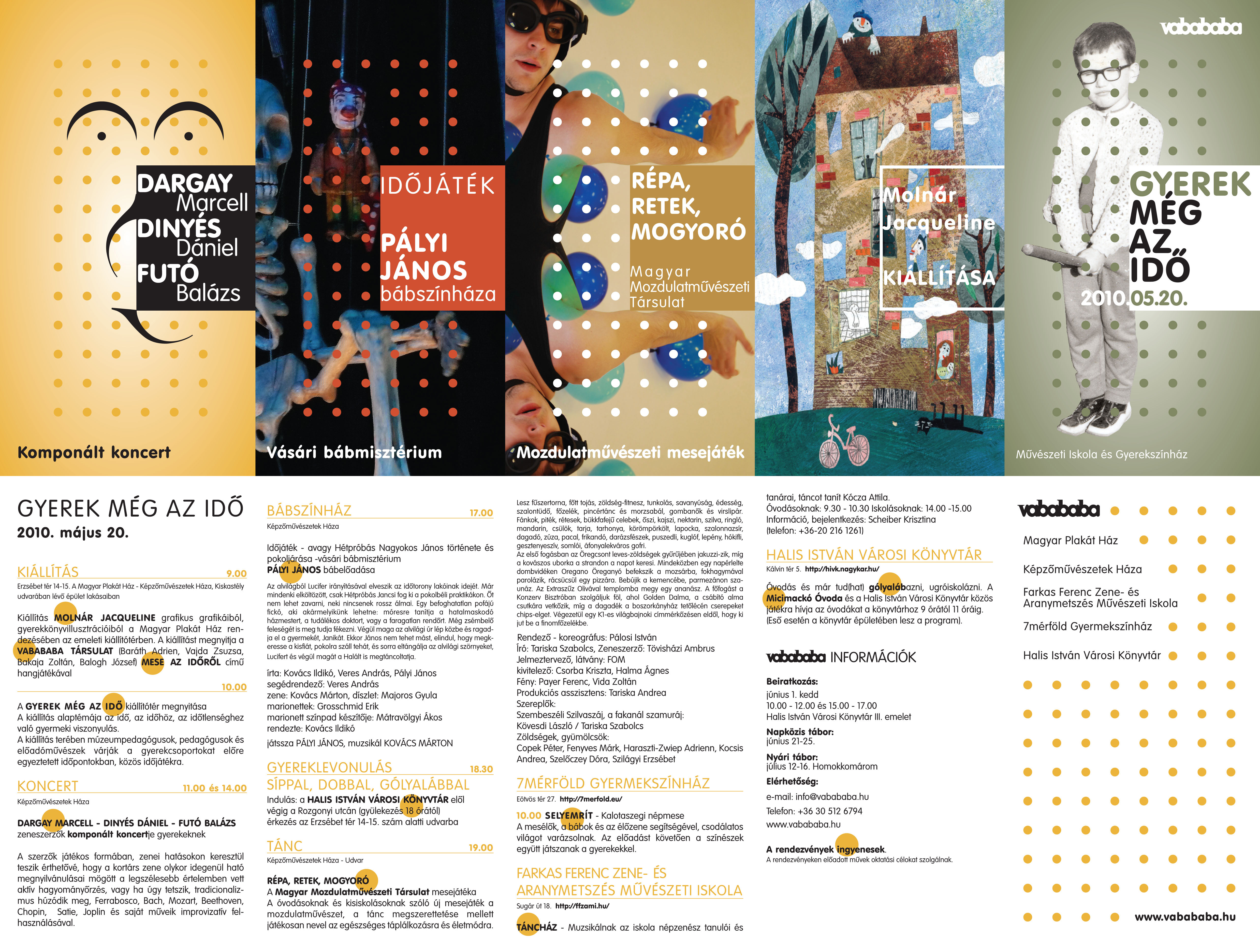 Nyilvános 1846 | 4472 | A programfüzet szövege: | GYEREK MÉG AZ IDŐ 2010. május 20. KIÁLLÍTÁS 9.00 Erzsébet tér 14-15. A Magyar Plakát Ház - Képzőművészetek Háza, Kiskastély udvarában lévő épület lakásaiban Kiállítás MOLNÁR JACQUELINE grafikus grafikáiból, gyerekkönyv-illusztrációiból a Magyar Plakát Ház rendezésében az emeleti kiállítótérben. A kiállítást megnyitja a VABABABA TÁRSULAT (Baráth Adrien, Vajda Zsuzsa, Bakaja Zoltán, Balogh József) MESE AZ IDŐRŐL című hangjátékával 10.00 A GYEREK MÉG AZ IDŐ kiállítótér megnyitása A kiállítás alaptémája az idő, az időhöz, az időtlenséghez való gyermeki viszonyulás. A kiállítás terében múzeumpedagógusok, pedagógusok és előadóművészek várják a gyerekcsoportokat előre egyeztetett időpontokban, közös időjátékra. KONCERT 11.00 és 14.00 Képzőművészetek Háza DARGAY MARCELL - DINYÉS DÁNIEL - FUTÓ BALÁZS zeneszerzők komponált koncertje gyerekeknek A szerzők játékos formában, zenei hatásokon keresztül teszik érthetővé, hogy a kortárs zene olykor idegenül ható megnyilvánulásai mögött a legszélesebb értelemben vett aktív hagyományőrzés, vagy ha úgy tetszik, tradicionalizmus húzódik meg, Ferrabosco, Bach, Mozart, Beethoven, Chopin, Satie, Joplin és saját műveik improvizatív felhasználásával. BÁBSZÍNHÁZ 17.00 Képzőművészetek Háza Időjáték - avagy Hétpróbás Nagyokos János története és pokoljárása - vásári bábmisztérium PÁLYI JÁNOS bábelőadása Az alvilágból Lucifer irányításával elveszik az időtorony lakóinak idejét. Már mindenki elköltözött, csak Hétpróbás Jancsi fog ki a pokolbéli praktikákon. Őt nem lehet zavarni, neki nincsenek rossz álmai. Egy befoghatatlan pofájú fickó, aki akármelyikünk lehetne: móresre tanítja a hatalmaskodó házmestert, a tudálékos doktort, vagy a faragatlan rendőrt. Még zsémbelő feleségét is meg tudja fékezni. Végül maga az alvilági úr lép közbe és ragadja el a gyermekét, Janikát. Ekkor János nem tehet mást, elindul, hogy megkeresse a kisfiát, pokolra száll tehát, és sorra eltángálja az alvilági szörnyeket, Lucifert és végül magát a Halált is megtáncoltatja. írta: Kovács Ildikó, Veres András, Pályi János segédrendező: Veres András zene: Kovács Márton, díszlet: Majoros Gyula marionettek: Grosschmid Erik marionett színpad készítője: Mátravölgyi Ákos rendezte: Kovács Ildikó játssza PÁLYI JÁNOS, muzsikál KOVÁCS MÁRTON GYEREKLEVONULÁS SÍPPAL, DOBBAL, GÓLYALÁBBAL 18.30 Indulás: a HALIS ISTVÁN VÁROSI KÖNYVTÁR elől végig a Rozgonyi utcán (gyülekezés 18 órától) érkezés az Erzsébet tér 14-15. szám alatti udvarba TÁNC 19.00 Képzőművészetek Háza - Udvar RÉPA, RETEK, MOGYORÓ A Magyar Mozdulatművészeti Társulat mesejátéka A óvodásoknak és kisiskolásoknak szóló új mesejáték a mozdulatművészet, a tánc megszerettetése mellett játékosan nevel az egészséges táplálkozásra és életmódra. Lesz fűszertorna, főtt tojás, zöldség-fitnesz, tunkolás, savanyúság, édesség, szalontüdő, főzelék, pincértánc és morzsabál, gombanők és virslipár. Fánkok, piték, rétesek, bükkfafejű celebek, őszi, kajszi, nektarin, szilva, ringló, mandarin, csülök, tarja, tarhonya, körömpörkölt, lapocka, szalonnazsír, dagadó, zúza, pacal, frikandó, darázsfészek, puszedli, kuglóf, lepény, hókifli, gesztenyeszív, somlói, áfonyalekváros gofri. Az első fogásban az Öregcsont leves-zöldségek gyűrűjében jakuzzi-zik, míg a kovászos uborka a strandon a napot keresi. Mindeközben egy napérlelte dombvidéken Oregano Öreganyó befekszik a mozsárba, fokhagymával parolázik, rácsücsül egy pizzára. Bebújik a kemencébe, parmezánon szaunáz. Az Extraszűz Olivával templomba megy egy ananász. A főfogást a Konzerv Bisztróban szolgáljuk föl, ahol Golden Dalma, a csábító alma csutkára vetkőzik, míg a dagadék a boszorkányház tetőlécén cserepeket chips-elget. Végezetül egy K1-es világbajnoki címmérkőzésen eldől, hogy ki jut be a finomfőzelékbe. Rendező - koreográfus: Pálosi István Író: Tariska Szabolcs, Zeneszerző: Tövisházi Ambrus Jelmeztervező, látvány: FOM kivitelező: Csorba Kriszta, Halma Ágnes Fény: Payer Ferenc, Vida Zoltán Produkciós asszisztens: Tariska Andrea Szereplők: Szembeszéli Szilvaszáj, a fakanál szamuráj: Kövesdi László / Tariska Szabolcs Zöldségek, gyümölcsök: Copek Péter, Fenyves Márk, Haraszti-Zwiep Adrienn, Kocsis Andrea, Szelőczey Dóra, Szilágyi Erzsébet 7MÉRFÖLD GYERMEKSZÍNHÁZ Eötvös tér 27. http://7merfold.eu/ 10.00 SELYEMRÍT - Kalotaszegi népmese A mesélők, a bábok és az élőzene segítségével, csodálatos világot varázsolnak. Az előadást követően a színészek együtt játszanak a gyerekekkel. FARKAS FERENC ZENE- ÉS ARANYMETSZÉS MŰVÉSZETI ISKOLA Sugár út 18. http://ffzami.hu/ TÁNCHÁZ - Muzsikálnak az iskola népzenész tanulói és tanárai, táncot tanít Kócza Attila. Óvodásoknak: 9.30 - 10.30 Iskolásoknak: 14.00 -15.00 Információ, bejelentkezés: Scheiber Krisztina (telefon: +36-20 216 1261) HALIS ISTVÁN VÁROSI KÖNYVTÁR Kálvin tér 5. http://hivk.nagykar.hu/ Óvodás és már tud(hat) gólyalábazni, ugróiskolázni. A Micimackó Óvoda és a Halis István Városi Könyvtár közös játékra hívja az óvodákat a könyvtárhoz 9 órától 11 óráig. (Eső esetén a könyvtár épületében lesz a program). VABABABA INFORMÁCIÓK Beiratkozás: június 1. kedd 10.00 - 12.00 és 15.00 - 17.00 Halis István Városi Könyvtár III. emelet Napközis tábor: június 21-25. Nyári tábor: július 12-16. Homokkomárom Elérhetőség: e-mail: info@vabababa.hu Telefon: +36 30 512 6794 www.vabababa.hu A rendezvények ingyenesek. A rendezvényeken előadott művek oktatási célokat szolgálnak. Magyar Plak