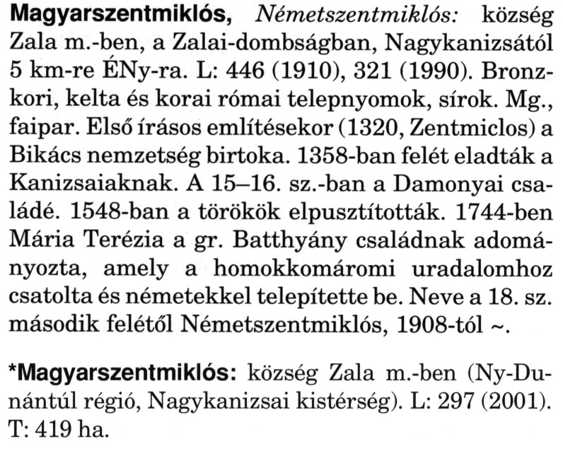 Nyilvános 2942 | 7347 | A szócikkek felismertetett szövege: | (A csillag után a kiegészítő kötetből származó szöveg következik) Magyarszentmiklós, Németszentmiklós: község Zala m.-ben, a Zalai-dombságban, Nagykanizsától 5 km-re ÉNy-ra. L: 446 (1910), 321 (1990). Bronzkori, kelta és korai római telepnyomok, sírok. Mg., faipar. Első írásos említésekor (1320, Zentmiclos) a Bikács nemzetség birtoka. 1358-ban felét eladták a Kanizsaiaknak. A 15–16. sz.-ban a Damonyai családé. 1548-ban a törökök elpusztították. 1744-ben Mária Terézia a gr. Batthyány családnak adományozta, amely a homokkomáromi uradalomhoz csatolta és németekkel telepítette be. Neve a 18. sz. második felétől Németszentmiklós, 1908-tól ~. *Magyarszentmiklós: község Zala m.-ben (Ny-Du-nántúl régió, Nagykanizsai kistérség). L: 297 (2001). T: 419 ha. A szócikkek a következő lexikonból származnak: Cím: Magyar nagylexikon Közreműködő: Élesztős László (1949) (szerk.) ; Barabás Éva (1943) (szerk.) ; Berényi Gábor (1946) (szerk.) ; Bárány Lászlóné (szerk.) ; Adelmann-né Kertész Judit (1945) (közrem.) ; Froemel Károlyné Jáky Éva (1936) (közrem.) ; Akadémiai Kiadó és Nyomda Vállala Szerz. közl.: [... Élesztős László főszerk.] ; [szerk. Barabás Éva et al.] ; [bibliogr. Adelmanné Kertész Judit] ; [kész. az Akadémiai Kiadó Magyar Nagylexikon Szerkesztőségében] Kiadás: Budapest : Akad. K., 1993- Kötetei: 1. köt., A - Anc 2. köt., And - Bag 3. köt., Bah - Bij 4. köt., Bik - Bz 5. köt., C - Csem 6. köt., Csen - Ec 7. köt., Ed - Fe 8. köt., Ff - Gyep 9. köt., Gyer - Iq 10. köt., Ir - Kip 11. köt., Kir - Lem 12. köt., Len - Mep 13. köt., Mer - Nyk 14. köt., Nyl - Pom 15. köt., Pon - Sek 16. köt., Sel - Szö 17. köt., Szp - Ung 18. köt., Unh - Z 19. köt., Kiegészítő kötet, A - Z ETO jelzet: 030=945.11 Szakjelzet: 030 Cutter: M 14 ISBN: 963-05-6611-7 [!ISBN 963-05-6615-X] Nyelv: magyar Megjegyzés: Az 5. kötettől kiad. a Magyar Nagylexikon Kiadó ; A 6. kötettől főszerk. Berényi Gábor ; A 6. kötettől szakszerk. Bárány Lászlóné et al. ; A 6. kötettől bibliogr. Froemel Károlyné ; Bibliogr. a szócikkek végén |