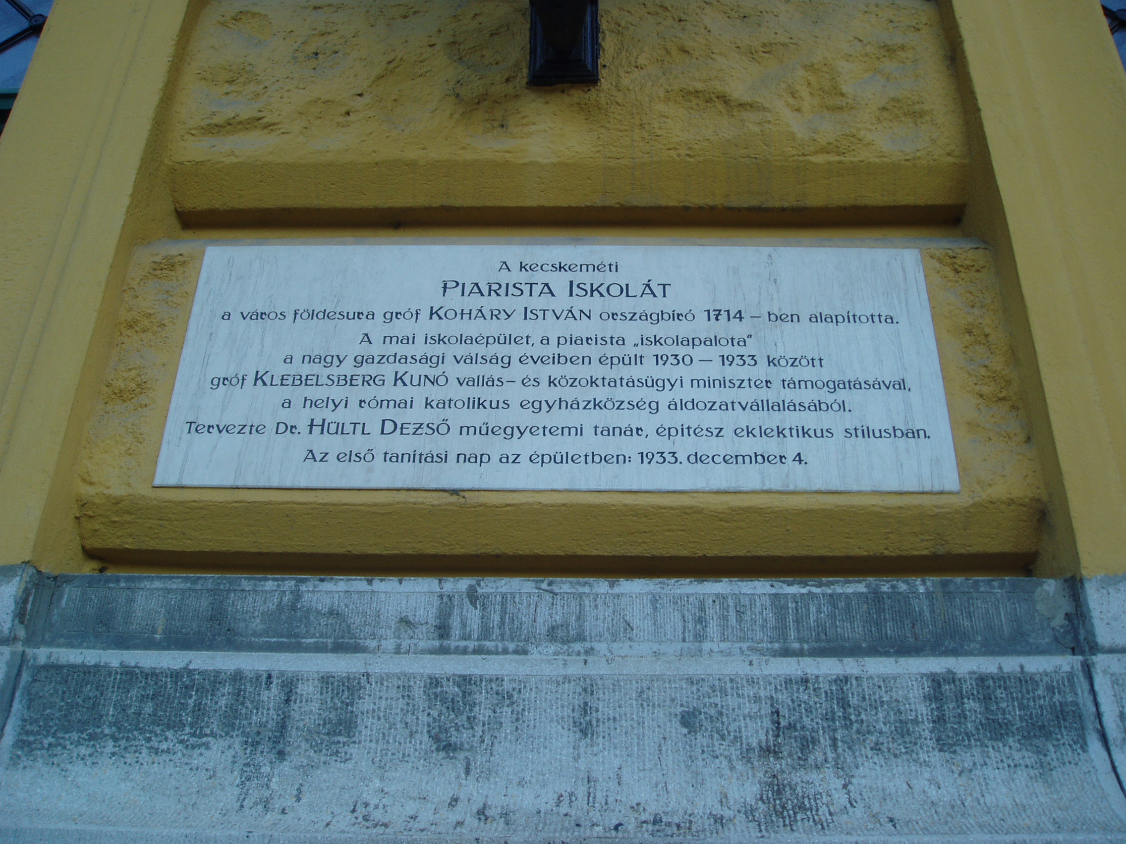 Nyilvános 1430 | 2100 | Kecskemét, Piaristák tere 5. | A mai Piarista Gimnázium és Általános Iskola a nagy múltú régi iskola (lásd: Kecskemét, Jókai u. 1.) közelében 1930 körül épült Hütl Dezső tervei alapján a hajdani főreáliskola helyére. A klasszicizáló huszártoronnyal díszített kétemeletes, monumentális iskolaépület homlokzati frontján Bory Jenő allegorikus szobrai láthatók. Mindkettőnek Kalazanci Szent József a főalakja. A fénykép 2006 augusztusában készült. Felh. irod.: Heltai Nándor: Kecskemét. Kecskeméti Lapok, 1998 |