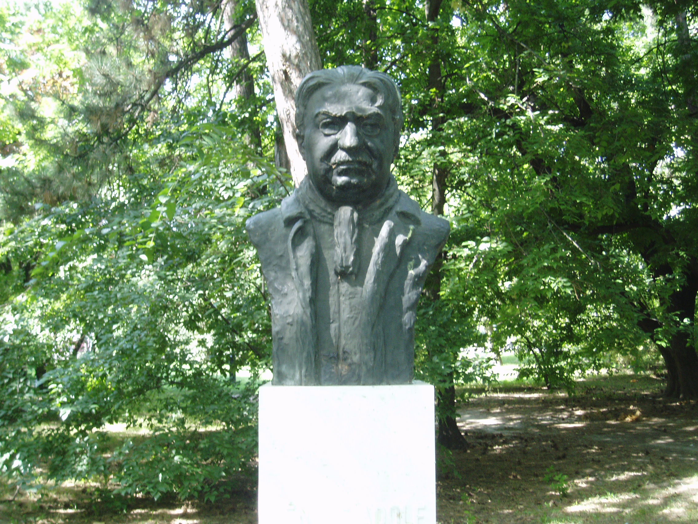 Nyilvános 1413 | 1928 | Kecskemét, Katona József park: Fényes Adolf szobra | A Vasútállomás közelében levő parkban alakították ki Kecskemét panteonját. Fényes Adolf (1867-1945) kecskeméti születésű festőművész szobra Petri Lajos alkotása. A fénykép 2006 augusztusában készült. Felh. irod.: Heltai Nándor: Kecskemét. Kecskeméti Lapok, 1998 |
