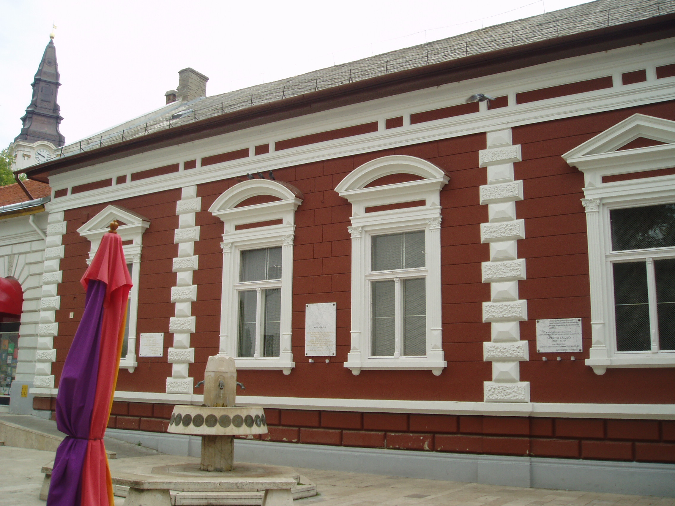 Nyilvános 1396 | 1886 | Kecskemét, Kéttemplomköz 6. | A református Ókollégium (lásd: Kecskemét, Kálvin tér 1.) Kéttemplomközre néző tornatermének falán helyezték el Németh László író, a "Kert-Magyarország eszme apostolának" emléktábláját. Ugyanitt egy másik márványtábla Ádám Jenőre, Kodály Zoltán egyik legközelebbi munkatársára emlékeztet. A fénykép 2006 augusztusában készült. |