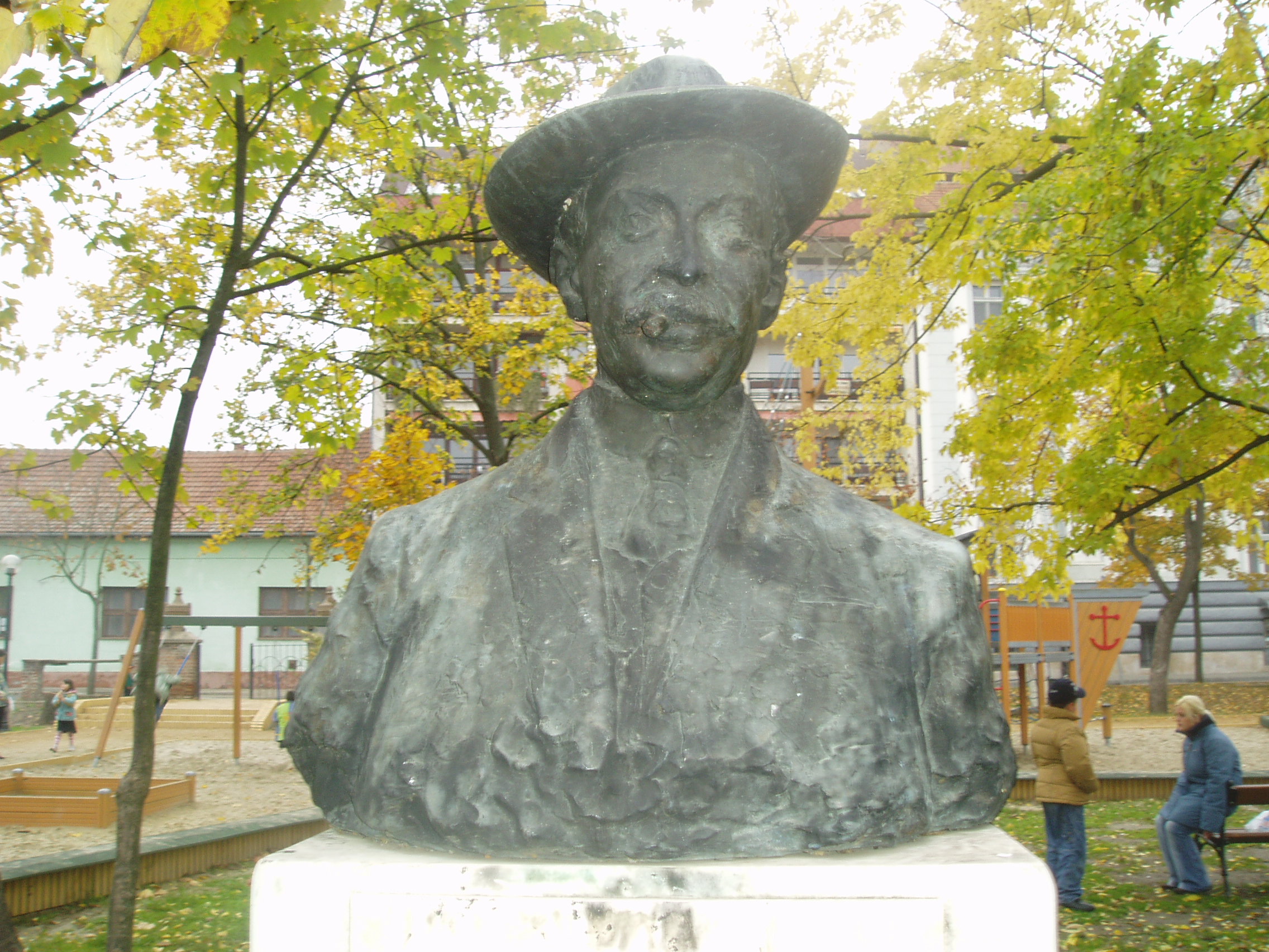 Nyilvános 1390 | 2425 | Baja, Déri kert | A belváros romantikus parkja Déri Frigyes, a bajai származású, szülővárosába dúsgazdagon hazatérő selyemgyáros, műgyűjtő nevét viseli, hiszen a szép sétakert az ő kezdeményezésére jött létre. Déri Frigyes röviddel az első világháború kitörése előtt gyermekkora városának ajánlotta fel gazdag egyetemes kultúrtörténeti gyűjteményét és könyvtárát. Fel akarta építeni a közművelődés házát, ezért vásárolta meg a ferences barátok kertjének egy részét, s azt a városnak ajándékozta. Az első világháború kitörése miatt azonban tervének megvalósítását a "béke helyreállta utáni" időkre halasztották. A háború után 1919-ben azonban Baja szerb megszállás alá került, s Déri - bizonytalannak ítélve a város sordát - visszavonta adományát, s gyűjteményét Debrecennek ajándékozta (lásd: Hajdú-Bihar megye/Debrecen, Déri tér 1.). Az általa megvásárolt területen pihenőparkot hoztak létre. Bejáratánál emléktábla örökíti meg Déri Frigyes nevét, akinek a parkban mellszobrát is felállították (lásd az előző képen). (Az ezen a képen látható szobor is valószínűleg Déri Frigyest ábrázolja, de sajnos semmilyen forrásban nem bukkantam adatra, mint ahogy az előző szobor alkotójáról sem - K.K.) A fénykép 2007 októberében készült. Felh. irod.: Látnivalók Bács-Kiskun megyében. Miskolc, Well-PRess, 2002 www.museum.hu/museum/index_hu.php?ID=108 |