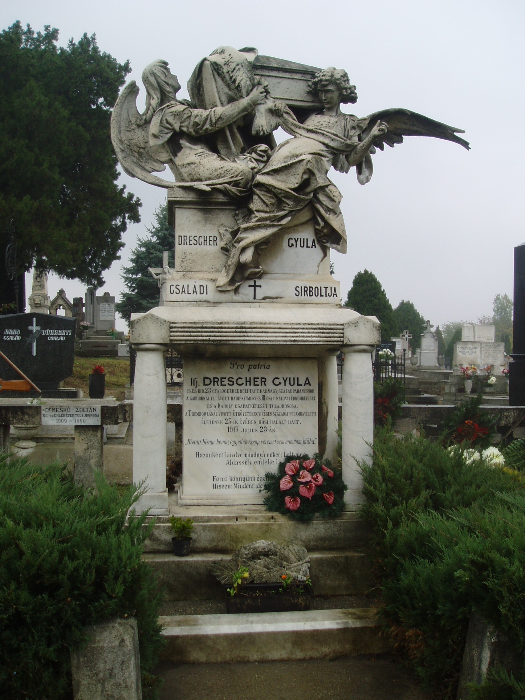 Nyilvános 1433 | 2089 | Baja, Rókus utva: Rókus temető - Drescher Gyula sírja | Itt nyugszik ifj. Drescher Gyula, a 23. gyalogezred tartalékos hadnagya, századparancsnok. Hősi halált halt életének 25. évében, 1917. november 23-án. A fénykép 2007 októberében készült. |