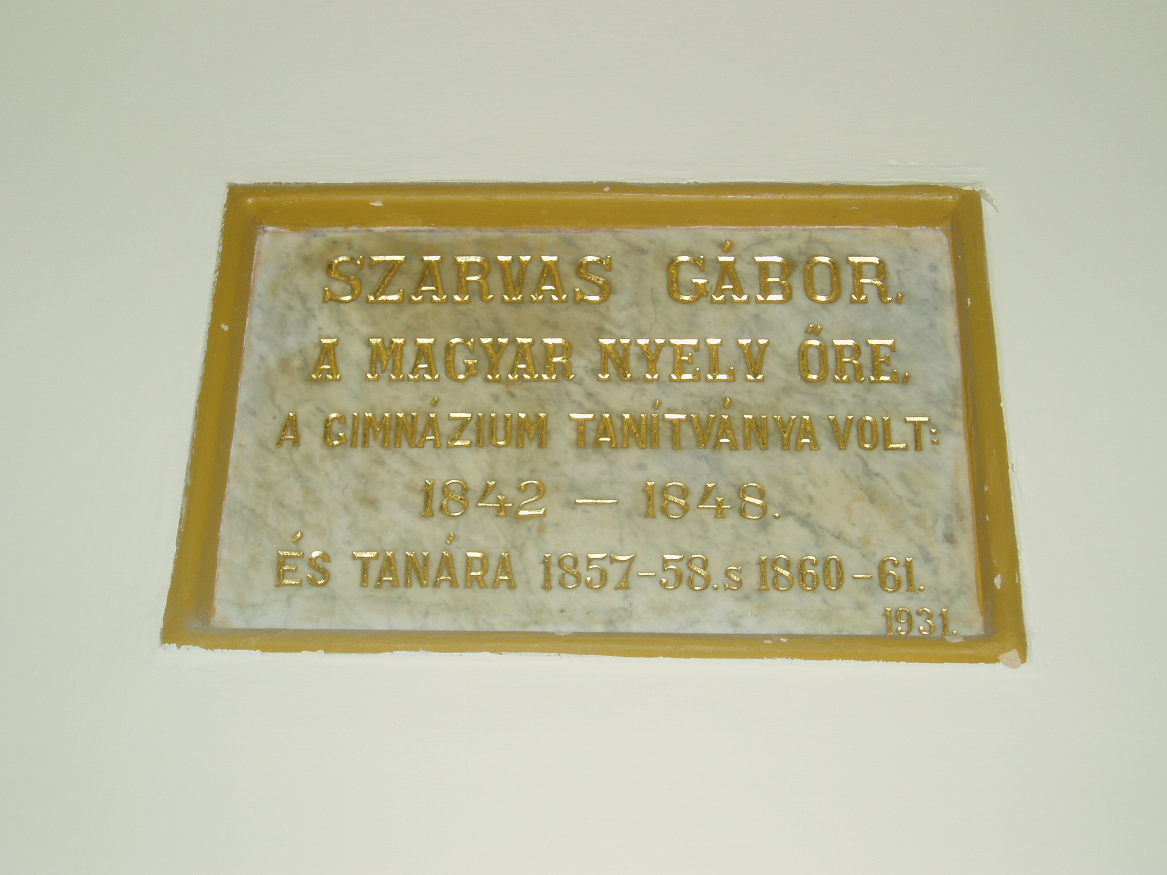 Nyilvános 1379 | 1762 | Baja, Szent Imre tér 5. III. Béla Gimnázium: Szarvas Gábor emléktáblája az előcsarnokban | Az 1757-ben alapított iskola mai épületét 1815-ben emelték, majd 1892-ben és 1931-ben jelentősen bővítették, alakították. Korábban a közelben ma is álló ferences kolostorban (lásd: Baja, Bartók B. u. 1-3.) folyt a tanítás. Az intézmény a ferencesek után 1879-től a ciszterci rendé lett. III. Béla nevét, aki a ciszter rendet letelepítette Magyarországon, az 1921/22-es tanévben vette fel. Ma már szobra is ott áll az épület előtt. 1948 óta állami iskola. Híres növendéke volt Nagy Ignác író (1819–1821), Türr István (1835–1840), Tóth Kálmán költő (1839–1845), Szarvas Gábor nyelvész (1842–1848), aki 1857-57 és 1860-61 között tanárként is működött itt. Pályakezdőként az 1905/06-os tanévben itt tanított Babits Mihály. Az iskolának a zenei életben nevet szerzett diákjai is voltak. Ide járt gimnáziumba az 1902/03-as tanévtől nyolc éven át a bajai születésű Kun Imre (1892–1977), a legendás hangversenyrendező és az 1940-es évek elején a szintén Baján született Lukin László (1926–2004) zenepedagógus, karnagy. A fénykép 2007 októberében készült. Felh. irod.: Bálint László: A bajai III. Béla Gimnázium. Bp. Tankönyvkiadó, 1989 |