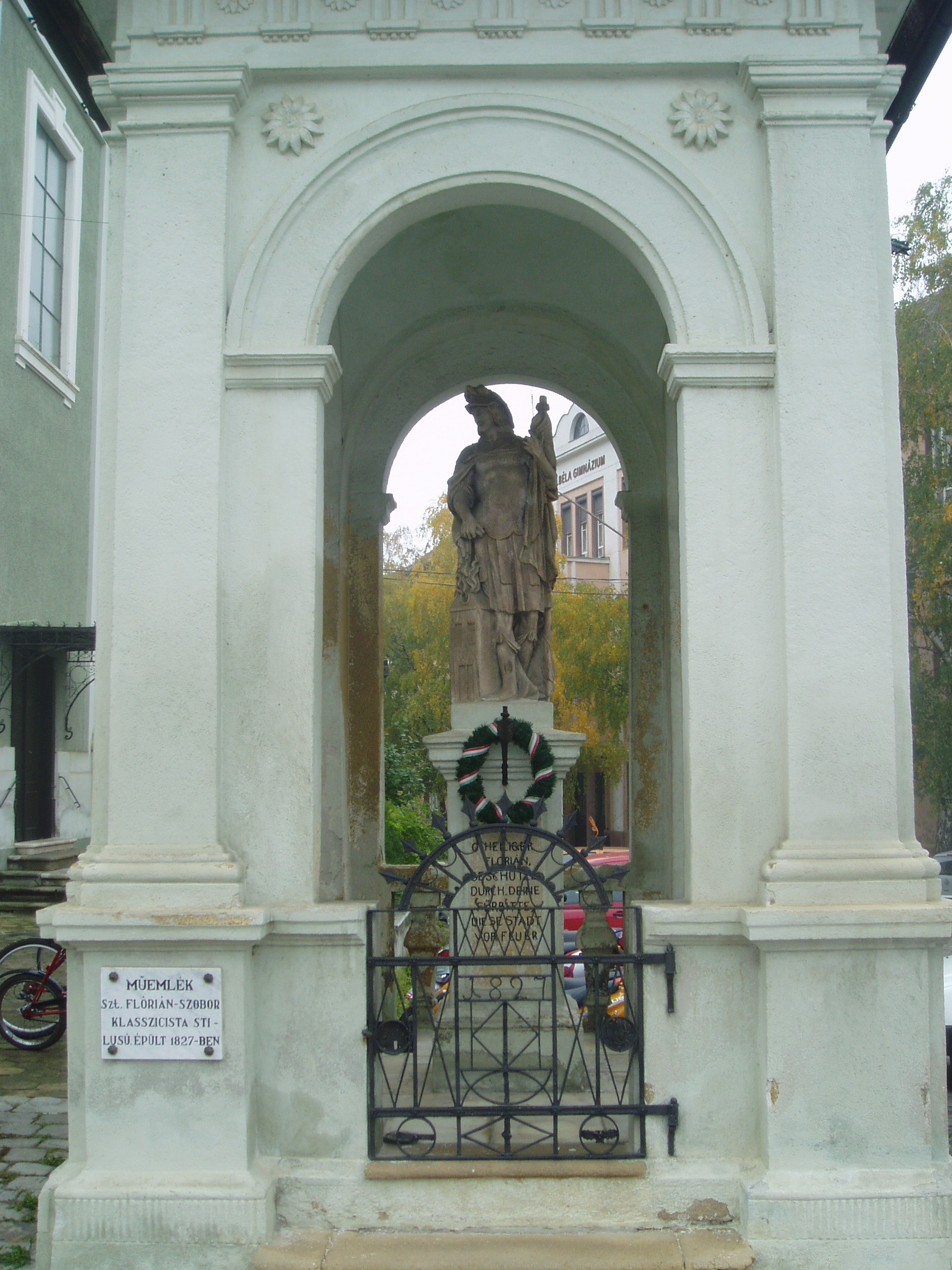 Nyilvános 1039 | 2027 | Baja, Szent Imre tér 5. Szent Flórián-szobor | A plébániatemplom melletti szoborfülkében áll 1827 óta Domenico Berti kőfaragó Szent Flóriánt ábrázoló, klasszicista stílusú szobra. A tűzoltók védőszentjének szobrát egy tekintélyes bajai polgár, Arnó György állíttatta azzal a fohásszal, hogy Szent Flórián védelmezze meg a várost a tűztől. Az első jelentős tűzvész, amiről források szólnak, 1742-ben pusztított Baján. Az ezt követő másfél évszázadban több mint ezerszer lobbant fel tűz a városban. Nagy tűz volt 1806-ban és 1819-ben, 1840-ben pedig az egész város leégett. A fénykép 2007 októberében készült. Felh. irod.: www.vendegvaro.hu Gál Zoltán: A bajai tűzoltóság hőskora. = www.bacskaisport.hu |