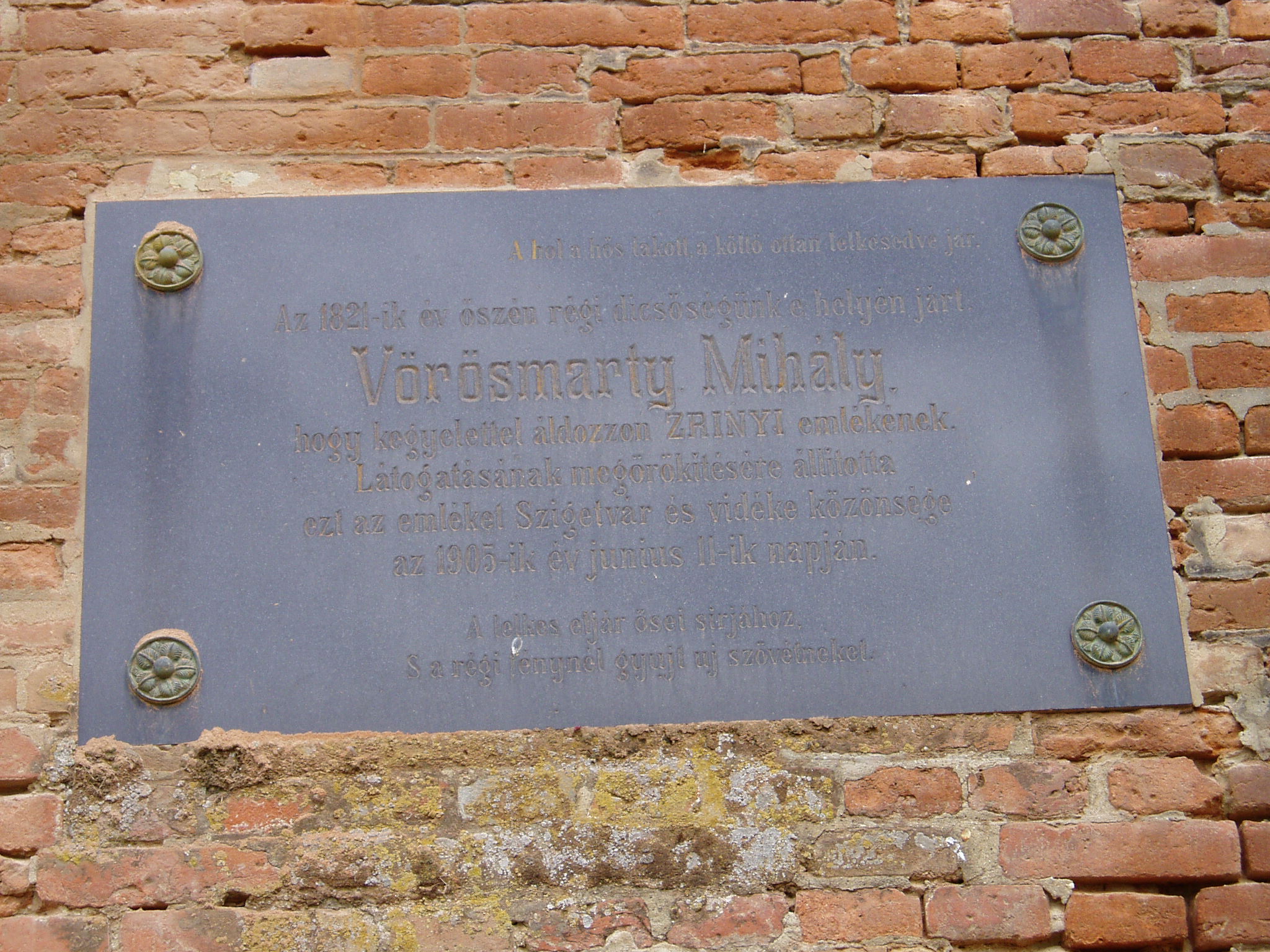 Nyilvános 1501 | 2134 | Szigetvár, Vár: Vörösmarty Mihály emléktáblája | A várban 1905-ben avatták fel Vörösmarty Mihály emléktábláját. A nagy magyar költő itt járt - az emléktábla felirata szerint - 1824 őszén, hogy kegyelettel adózzon Zrínyi Miklós történelmi tette előtt. Szigetvár című versét 1822-ben írta; lehet, hogy az emléktáblán nem pontos az évszám, vagy többször is járt ezen a helyen. Vörösmarty Mihály: Szigetvár Láttam veszélyes tájadat, oh Sziget! Előttem állott roskadozó falad, Előttem a múlt kor csatái S gyászba borúlt ege Hunniának. Itt késve mérgét nyelte az agg török; Itt táboroztak népei dölyfösen, Ott fenn erős, de számra kisded, S győzve fogyó hadaink tanyáztak. S onnan, ha kellett; mint az egek nyila A záporoknak vad zuhanási közt, Csattogva, sujtva, száz halálban Törtek alá rabölő haraggal. Kétszázezerrel víva meg egy marok Népség s vitái győztösek annyiszor, De ah! – borúlj el gyászhozó nap! – A diadal közepett enyésztek. Vagy mely tünő fény leng szemeim felé? A csendes éjnek rémi talán? – Vagy a Fagyos halálnak váza, vagy bús Képe az ősi idők fiának? Oh Zrínyi roncsolt képe, te vagy! Dicső Hős hajdan a vérfergetegek között, Rémítve villogsz most előmbe Századaink sanyarú korából: Duló vasat tart rettenetes karod, Elszánt komolyság terjedez arcodon, Lelkedben a szép hír, boszúság És kitörő harag ég szivedben. Mert vesztegelnek társaid a mezőn, Csatátlanul, rosz, gyáva tanács miatt, Míg téged a veszélyek útán Sírba viszen csapodár szerencse. Te a hazáért halni tudál; dicső! Mi nem tudunk már érte csak élni is; A támadó nap tudja, látja, A szomorún nyugovó, bününket. Mikor szününk meg bor, szerelem között A hon virultát messze felejteni? Mikor kerülhet vissza a künn Elpazarolt arany és dicsőség? Hajh elközelget majd az enyészet így! Eltörli a nép bajnoki tetteit: Megdőlnek a fajult vitézek, Sírjai hős eleik nevének. Börzsöny, 1822 A fénykép 2005 júniusában készült. |