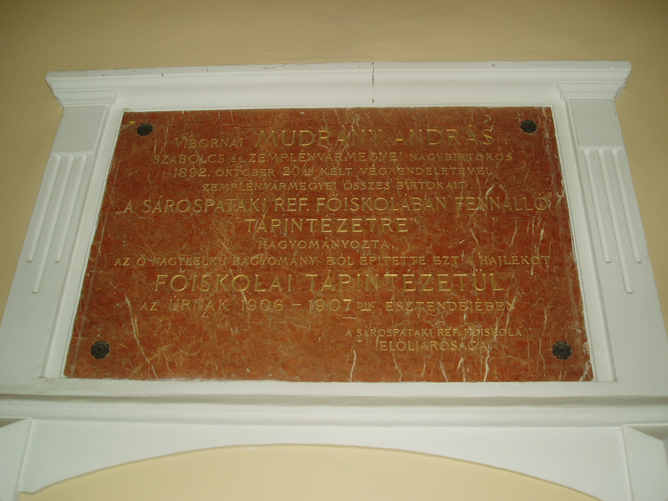 Nyilvános 1867 | 3829 | Sárospatak, Comenius utca 1. | Ez volt a pataki kollégium (lásd: Sárospatak, Rákóczi u. 1.) ún. tápintézete, azaz menzája, étkezdéje. Mint emléktáblájáról megtudható, Mudrány András adományából 1907-ben épült. A fénykép 2007 augusztusában készült. Felh. irod.: Látnivalók Borsod-Abaúj-Zemplén megyében. Miskolc, Well-PRess, 1995 |