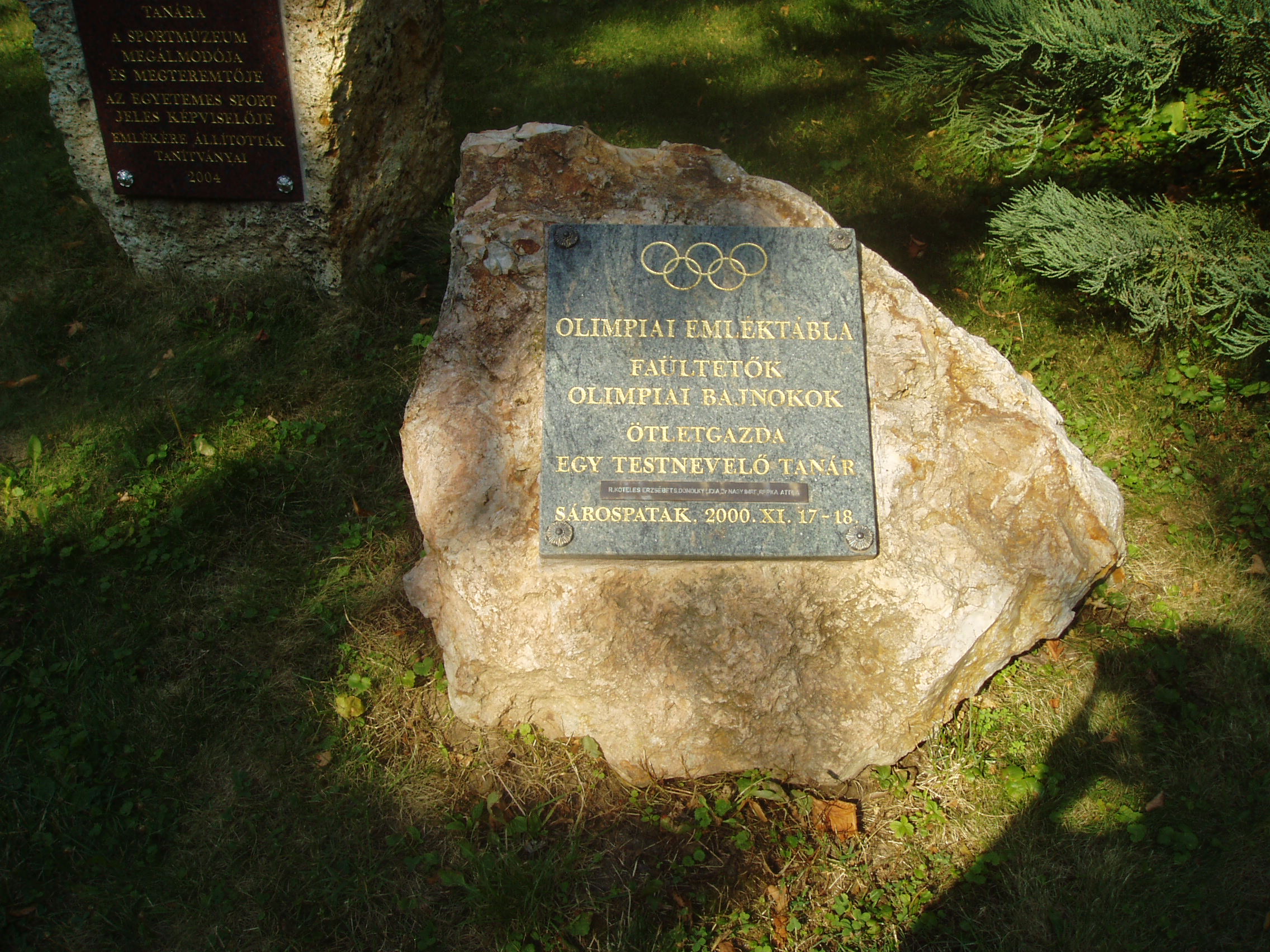Nyilvános 1389 | 1963 | Sárospatak, Iskolakert: A pataki diákok emlékezete | A Református Kollégium (lásd: Sárospatak, Rákóczi u. 1.) bejáratával szemben találjuk az Iskolakertnek nevezett parkot. Az 1980-as években természetvédelmi területté nyilvánított Iskolakert sajátos nemzeti érték, mely egyedülálló az országban. Sétányai mentén Patakhoz kötődő jeles személyiségek szobrai állnak. Az iskolakertben álló műemlék tornacsarnok közelében is elhelyeztek néhány feliratos emlékkövet. A képen a 2000-ben felállított Olimpiai emléktábla látható. A fénykép 2007 augusztusában készült. Felh. irod.: Látnivalók Borsod-Abaúj-Zemplén megyében. Miskolc, Well-PRess, 1995 |