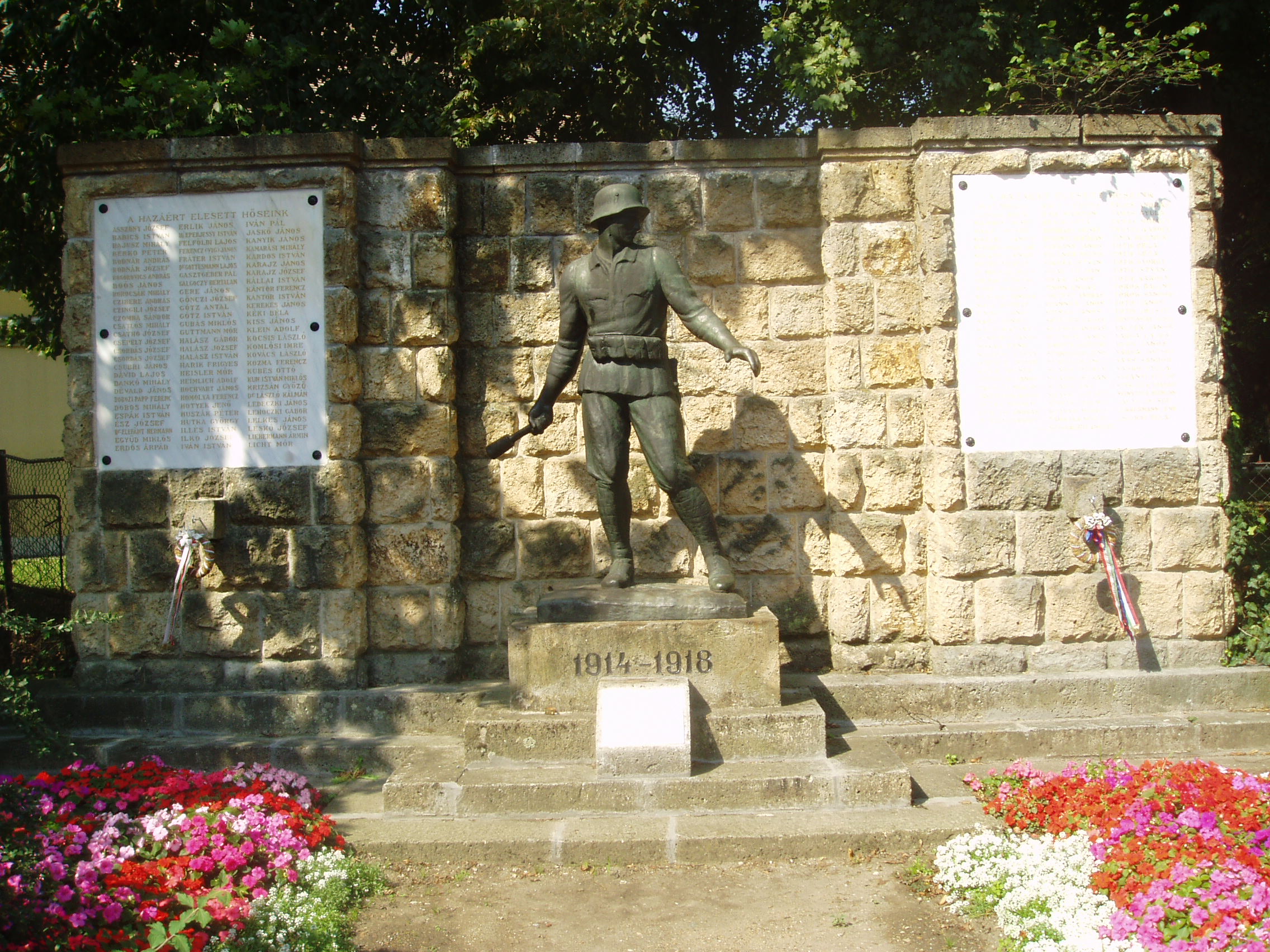 Nyilvános 1827 | 4233 | Sárospatak, Iskolakert bejárat: I. világháborús emlékmű | A Református Kollégium (lásd: Sárospatak, Rákóczi u. 1.) bejáratával szemben találjuk a hét hektáros Iskolakertet. Bejáratát két emlékmű fogja közre. A Táncsics utca felőli oldalon áll az I. világháború hőseinek emlékét idéző, gránátot dobó honvéd bronzszobra. Medgyessy Ferenc alkotását 1935-ben leplezték le. A fénykép 2007 augusztusában készült. Felh. irod.: www.vendegvaro.hu |