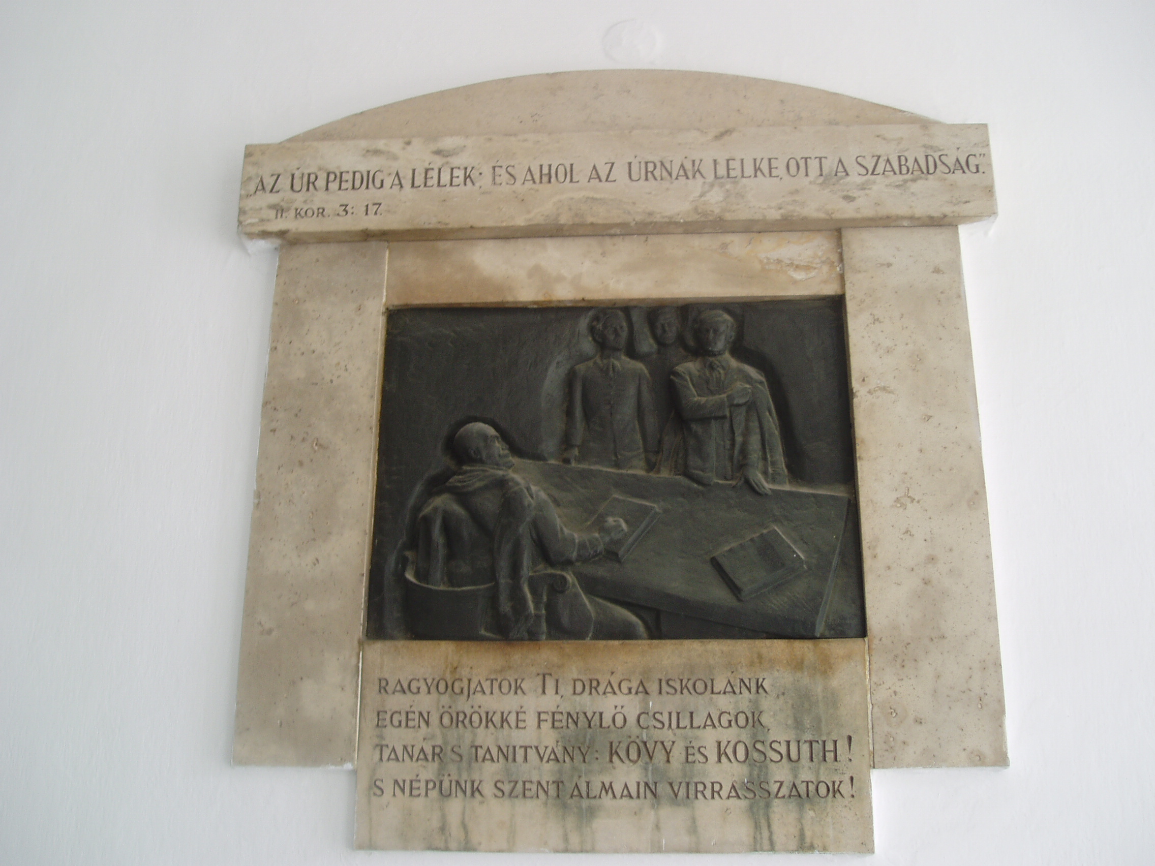 Nyilvános 1365 | 1908 | Sárospatak, Rákóczi utca 1. Református Kollégium | A kollégium főépülete, a Nagy Kollégium a Rákóczi út északi végén található, mely 1804–1814 között korai klasszicista stílusban épült. Szép ráccsal ellátott, háromíves nyílású kapuzat vezet be az un. „nagyportá”-ba, amelyet két sor vaskos pillér három hajóra oszt. Kétoldalt a falakon az iskolatörténet néhány fontosabb eseményének, illetve a kollégium nagy alakjainak bronz domborművű ábrázolásait helyezték el. A képen Kövy Sándor és Kossuth Lajos domborműve látható. Alkotója Szabados Béla szobrászművész. Állítatta 1940-ben a Pataki Diákok Országos Szövetsége. Kövy Sándor (1763-1829) a sárospataki református jogakadémián a magyar jog első professzoraként többek között Kossuth Lajos tanára volt. A dombormű a jeles tanárnak és nagy tanítványának állít emléket. Sokat idézett anekdota, hogy egy afférjuk után Kövy azt mondta a fiatal Kossuthnak - amit később maga a nagy államférfi örökített meg visszaemlékezéseiben: "a dominus Kossuthból országháborító lesz!" Kövyt kiváló jogtudósként is számon tartották. Számos latin és magyar nyelvű jogtudományi munkája jelent meg, közülük a latin nyelvű "Elementa" fél évszázadon keresztül az egyik legelterjedtebb jogi tankönyvként szerepelt. "A' magyar törvénynek rövid summája a' gyermekek számára" című könyvét 1848-ig a sárospataki gimnázium alsóbb osztályaiban tankönyvként használták. Ez az 1798 óta számos kiadást megért, 1989-ben hasonmás kiadásban is megjelentetett munkája a feudális magyar polgári jog közérthető összefoglalása. Alakját Mikszáth Kálmán is megörökítette "Különös házasság" című regényében. (Lásd még: Sárospatak, Kossuth u. 25.). A fénykép 2007 augusztusában készült. Felh. irod.: Détsy Mihály: Sárospatak. Bp. Corvina, 1974 Látnivalók Borsod-Abaúj-Zemplén megyében. Miskolc, Well-PRess, 1995 www.sarospatak.hu/nevezetessegek Lukács László: Anekdoták Kossuthról és Kövyről. = www.kodolanyi.hu/szabadpart/14/14_muv_lukacs.html |
