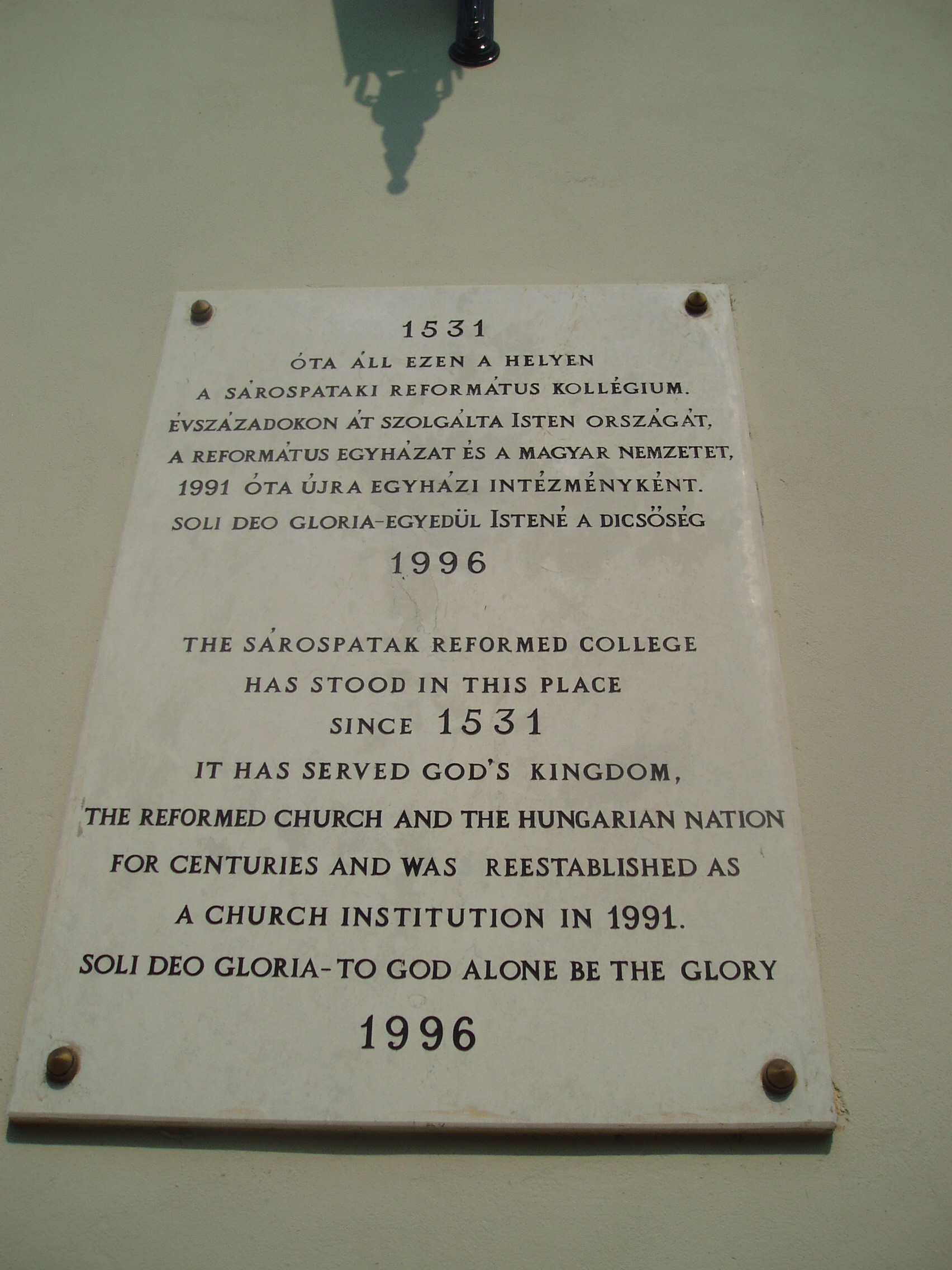 Nyilvános 1365 | 1824 | Sárospatak, Rákóczi utca 1. Református Kollégium | A kollégium főépülete, a Nagy Kollégium a Rákóczi út északi végén található, mely 1804–1814 között korai klasszicista stílusban épült. Szép ráccsal ellátott, háromíves nyílású kapuzat vezet be az un. „nagyportá”-ba, amelyet két sor vaskos pillér három hajóra oszt. Kétoldalt a falakon az iskolatörténet néhány fontosabb eseményének, illetve a kollégium nagy alakjainak bronz domborművű ábrázolásait helyezték el. Az 1996-ban állított feliratos tábla arról emlékezik meg, hogy a pataki kollégium 1531 óta áll ezen a helyen. A fénykép 2007 augusztusában készült. Felh. irod.: Détsy Mihály: Sárospatak. Bp. Corvina, 1974 Látnivalók Borsod-Abaúj-Zemplén megyében. Miskolc, Well-PRess, 1995 www.sarospatak.hu/nevezetessegek |