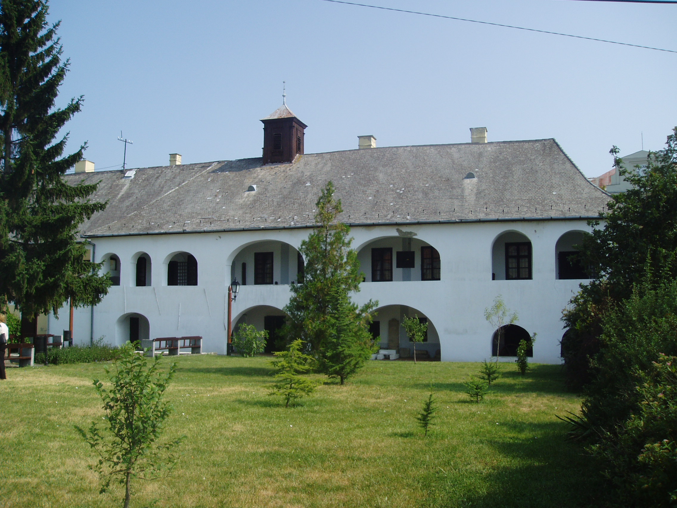 Nyilvános 1336 | 1847 | Sárospatak, Rákóczi utca 1. Református Kollégium | A Kollégium főépületének szárnyai által határolt tágas udvarban áll a régi iskolaépületek utolsó maradványa, az ún. Berna-sor. 1771/72-ben a fizika oktatása számára és a fizikaprofesszor lakásául épült. Az egyemeletes, hosszú szárny déli oldalát később kétszintes, árkádos tornáccal bővítették, feljáróval a nyugati oldalon. Az épület a korabeli provinciális magyar építészet szép példája. Az emelet boltozott termeiben a kollégium történetét bemutató kiállítás látható. A fénykép 2007 augusztusában készült. Felh. irod.: Détsy Mihály: Sárospatak. Bp. Corvina, 1974 |