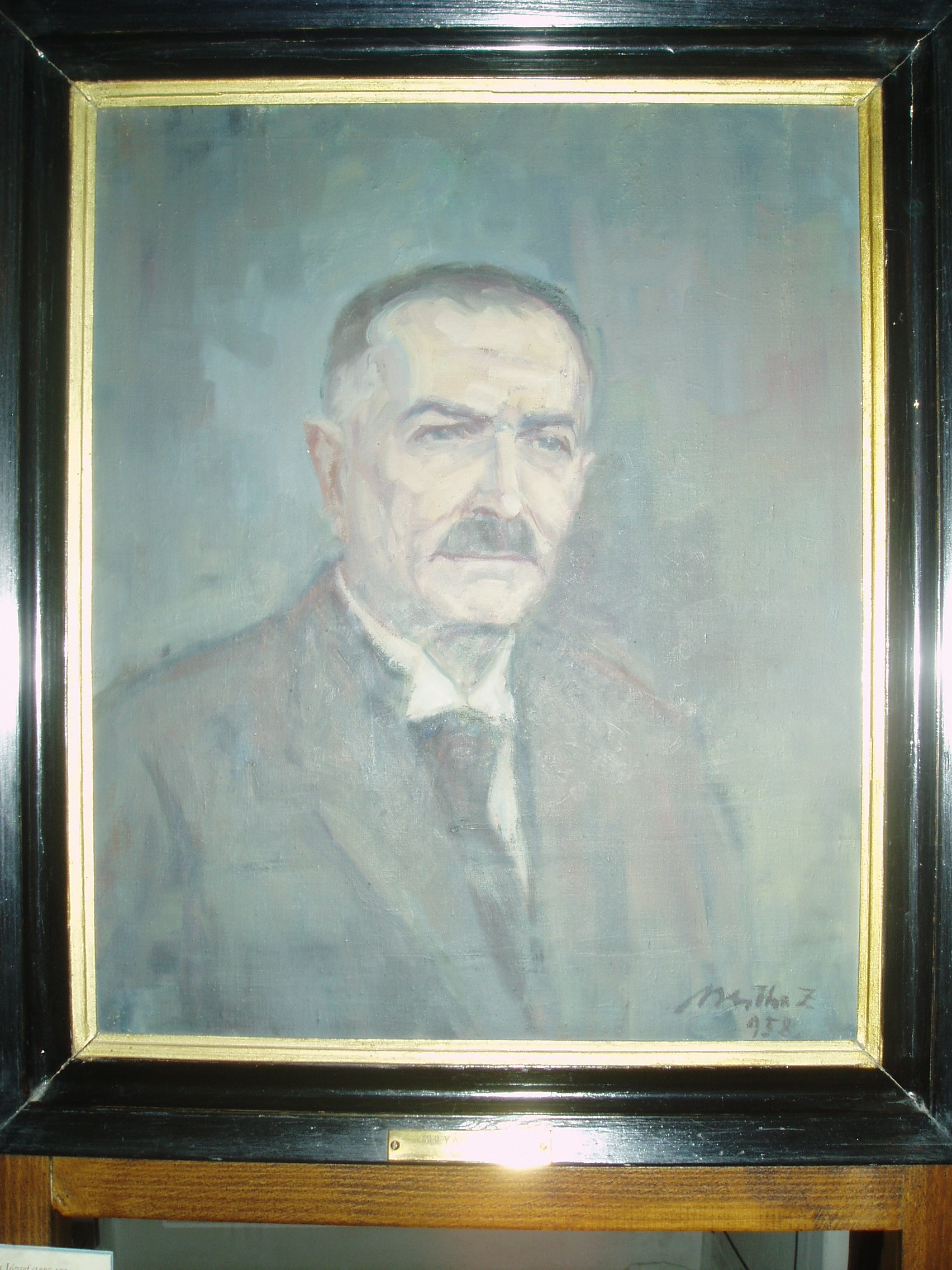 Nyilvános 1343 | 1822 | Sárospatak, Rákóczi utca 1. Református Kollégium könyvtára | A képen Gulyás József (1885-1954) főkönyvtárnok portréja, Bertha Zoltán olajfestménye látható. Gulyás József 1928 és 1944 között volt a könyvtár igazgatója. Több tanulmányt készített a főiskola és a könyvtár történetéről. A fénykép 2007 augusztusában készült. Felh. irod.: www.gradatio.hu/nagykonyvtar |