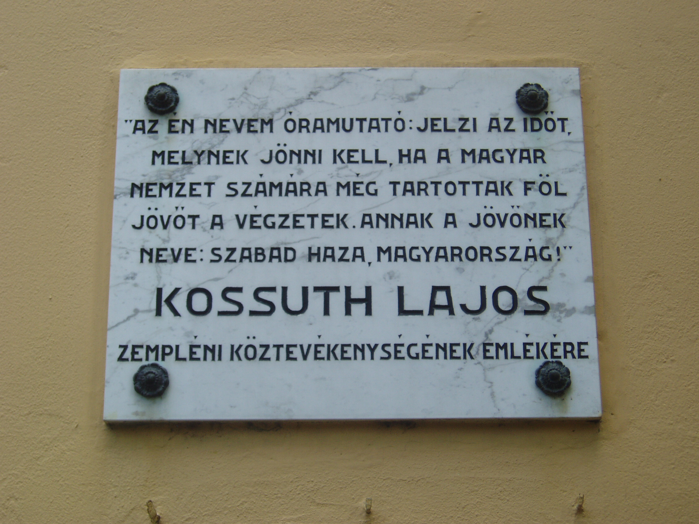 Nyilvános 1366 | 2184 | Sátoraljaújhely, Kossuth tér 5. | A városháza (volt megyeháza) a fő tér hangulatát meghatározó barokk stílusban épült 1754-1768 között. Az olasz építészek által tervezett épület impozáns méreteivel az állandóság és a méltóság érzetét kelti. A főbejárat fölötti erkély mögötti díszteremben mondta a fiatal Kossuth első szónoklatát 1831-ben, a koleralázadás idején (az útikönyvekben a beszéd helyeként következetesen az erkélyt említik). Kossuth Lajos szülei 1808. február végén Olaszliszkáról költöztek Újhelybe. 1810 és 1816 között a város piarista gimnáziumának növendéke volt. 1824-ben Pestet otthagyva visszatért Újhelyre, ahol magánügyvédként dolgozott. 1827-ben Zemplén megye táblabírája, 1830-ban Sátoraljaújhely, 1832-ben a vármegye ügyésze lett. Közéleti szereplése 1831-ben a vármegyei közgyűlésen a kolerajárvány kapcsán a jobbágyság társadalmi helyzetéről elmondott beszédével kezdődött. Kossuth többször is felszólalt az épületben, az akkori megyeházán, mint a formálódó ellenzék egyik vezérszónoka. Szokatlan és merész szónoklatait szemtanúként az idős Kazinczy Ferenc is felemlegette levelezésében. Egyik protestáló felszólalását így örökítette meg: "Erre felkele Kossuth Lajos, s oly tűzzel, mintha kezében volna a zendítés szövétneke, két kezét csípejére rakván, képzelhetetlen vakmerőséggel tartá beszédét." Kossuth sátoraljaújhelyi emlékét utca, tér, szobor, több intézmény és emléktábla őrzi. Emléktábla található egykori iskolája falán (lásd: Sátoraljaújhely, Deák F. u. 10-12.), a városháza dísztermében, illetve azon házakon, ahol egykor ő, illetve szülei, testvérei laktak (lásd: Sátoraljaújhely, Móricz Zs. u. 17. és Hősök tere 8.). A fénykép 2007 augusztusában készült. Felh. irod.: Látnivalók Borsod-Abaúj-Zemplén megyében. Miskolc, Well-PRess, 2003 www.satoraljaujhely.hu/nevezetessegek www.vendegvaro.hu Fehér József: Két újhelyi Kossuth-legenda. = Széphalom. A Kazinczy Társaság Évkönyve 12. kötet, 2002 |