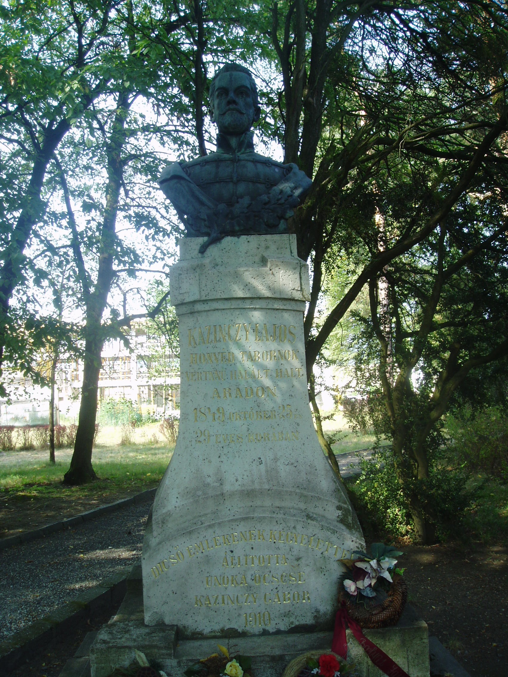 Nyilvános 1361 | 1886 | Széphalom: A Kazinczy család sírkertje - Kazinczy Lajos szobra | A Kazinczy Emlékcsarnok parkja - Kazinczy Ferenc egykori kúriájának kertje - ma természetvédelmi terület. A mauzóleumból fasor vezet a Kazinczy család sírkertjébe. A kis temető helyét 1806-ban, első gyermeke, az egyéves korában elhunyt Iphigenia halálakor Kazinczy maga jelölte ki. Már akkor megírta barátainak, hogy felesége és ő is oda fognak temetkezni. Legkisebbik fiuk, Lajos, Aradon szenvedett vértanúhalált a honvédsereg ezredeseként. 1849. október 25-én, 29 éves korában végezték ki. Földi maradványait az aradi vársánc rejti. Szülei sírjának közelében felállított mellszobra idézi emlékét. A szobor másolata a sárospataki kollégium kertjében látható (lásd: Sárospatak, Iskolakert: Kazinczy Lajos). A fénykép 2007 augusztusában készült. Felh. irod.: Látnivalók Borsod-Abaúj-Zemplén megyében. Miskolc, Well-PRess, 2004 www.vendegvaro.hu Pávai Gyula: Kazinczy Lajos emléktáblája Aradon. = Széphalom. A Kazinczy Ferenc Társaság Évkönyve 13. kötet, 2003 |