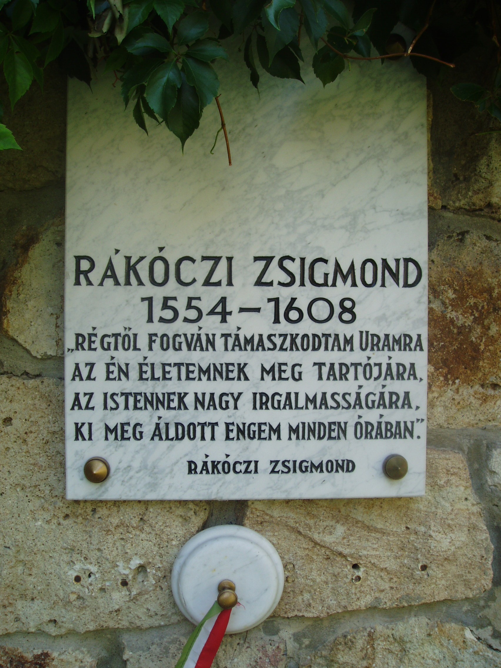 Nyilvános 917 | 1394 | Szerencs, Huszárvár utca 11. Zempléni Panteon: Rákóczi Zsigmond (1544-1606) emléktáblája | A szerencsi Rákóczi várnál 1996-ban, a honfoglalás ezredeik évfordulója alkalmából állították fel a jeles zempléni személyiségek panteonját. Rákóczi Zsigmond volt a Rákóczi család vagyonának és tekintélynek megalapozója. Korának legnagyobb politikai karrierjét futotta be. 1544-ben egy kisbirtokosi családba született, de ügyes pénzügyi manővereinek és jó házasságainak köszönhetően nagy kiterjedésű és jelentős birtokok, várak, kastélyok ura lett, s életének utolsó időszakában Erdély fejedelmének választották. A tokajiból kiszakított szerencsi uradalom zálogbirtokát 1583-ban kapta meg, s ez 1603-ban a család örökös tulajdona lett. Itt építette meg Zsigmond a Rákócziak első várerődítményét. Itt születtek fiai: György, (a későbbi erdélyi fejedelem), Zsigmond és Pál. Több évtizeden át, (egészen 1616-ig) Szerencs volt a Rákóczi-birtokok központja. Végső akarata szerint ide temették el az első Rákóczit, aki Erdély fejedelmi címét is viselte (lásd: Szerencs, Kossuth tér 4.). Az õ anyagi támogatásával jelent meg Károli Gáspár fordításában a magyar biblia. A fénykép 2007 augusztusában készült. Felh. irod.: Fazekas Lászlóné: Szerencs. Szerencs, Szerencsi Hírek Szerkesztősége, 1997 www.vendegvaro.hu Látnivalók Borsod-Abaúj-Zemplén megyében. Miskolc, Well-PRess, 2004 www.hermuz.hu/aktual/archiv/kiallarc3.htm |