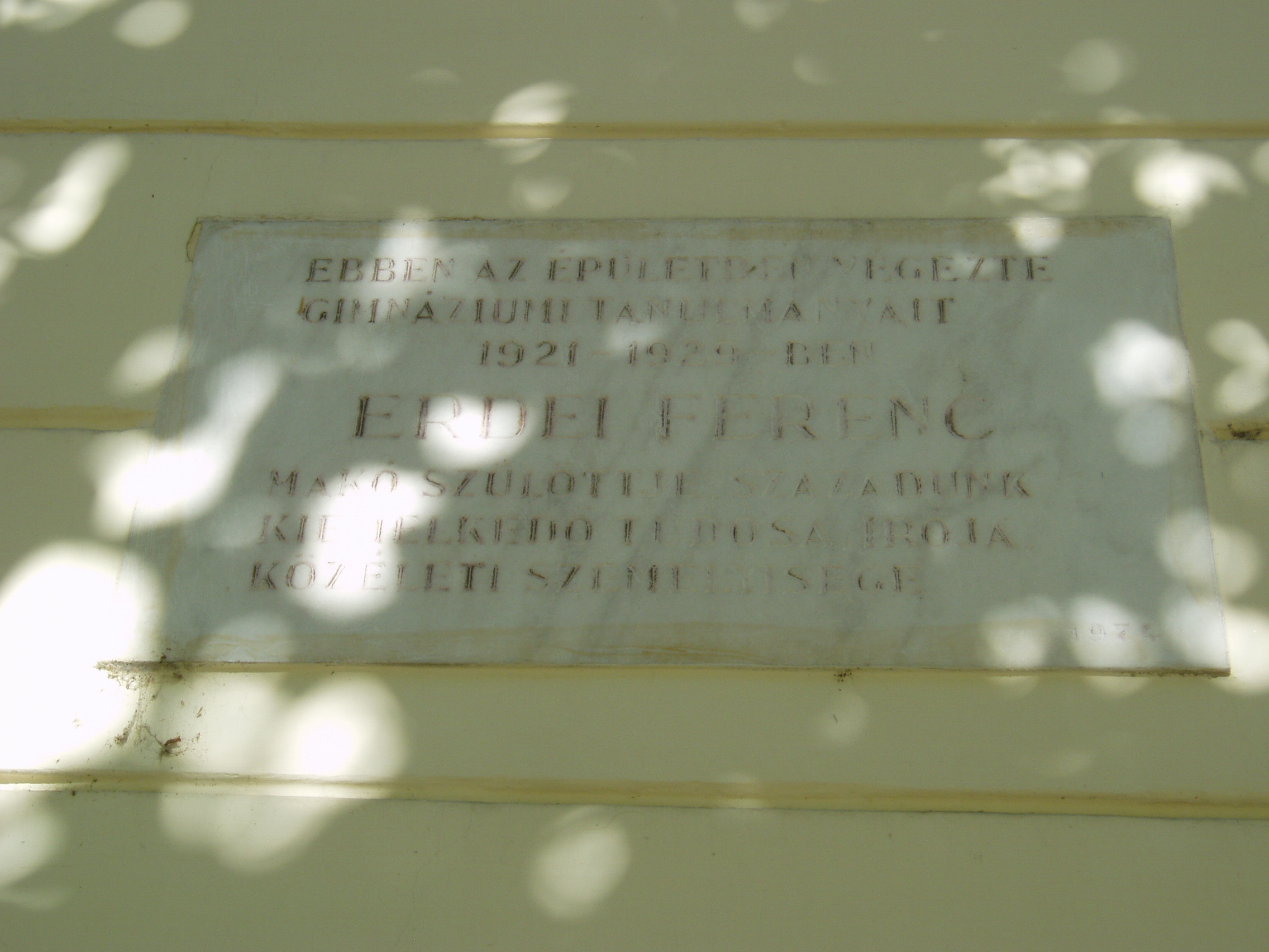 Nyilvános 1418 | 1892 | Makó, Csanád vezér tér 6. József Attila Gimnázium | A város központjából északra nyílik a sugárútszerű Csanád vezér tér. Nyugati oldalán áll a József Attila Gimnázium 1895-ben, eklektikus stílusban, Gerle Lajos tervei alapján emelt épülete. Itt tanított négy évig Juhász Gyula, itt tanult József Attila, majd Erdei Ferenc. A képen Erdei Ferenc (1910-1971) agrárközgazdász, politikus, szociográfus, tudományszervező emléktáblája látható, aki az 1920-as években volt a gimnázium diákja. A fénykép 2007 júliusában készült. Felh. irod.: Barangolások Csongrád megyében. Miskolc, Well-PRess, 1997 |