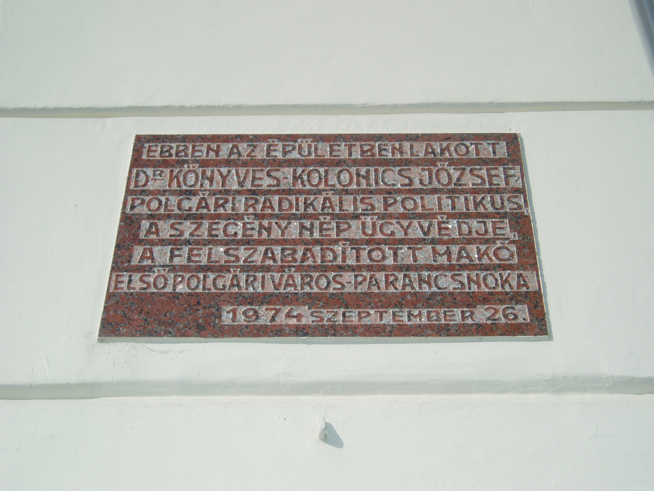 Nyilvános 1394 | 1856 | Makó, József Attila utca 2. | Ebben a házban lakott Könyves Kolonics József (1884-1955) polgári radikális politikus, a szegények ügyvédje, 1945 után Makó első polgári városparancsnoka. Emléktábláját születésnek 90. évfordulóján állították. A fénykép 2007 júliusában készült. |