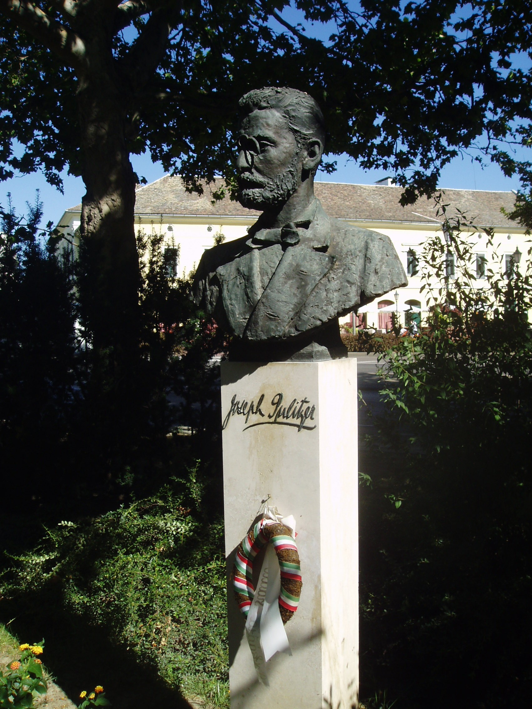 Nyilvános 1358 | 1785 | Makó, Széchenyi tér 13-15. | A Széchenyi teret déli oldalról az 1970-ben épült ún. csipkeházsor határolja, földszintjén üzletekkel. A házsor előtti kis parksávban a makói születésű Pulitzer József (1847-1911) mellszobra áll (Kiss Jenő alkotása). Az egyetemes sajtótörténet kiemelkedő alakja a makói városháza közelében, az Úri utca 4. számú, azóta emléktáblával megjelölt házban született (sajnos, amikor Makón jártam, ezt az információt még nem tudtam, ezért nincs róla kép - K.K.). Elszegényedett kereskedőcsaládból származott, iskoláit Budapesten végezte. A katonai pálya iránt vonzódott, de gyenge egészsége, rossz szeme miatt sorra elutasította az osztrák hadsereg, a francia idegenlégió és az angol gyarmati hadsereg. Tizenhat évesen hajófűtőként vándorolt ki Amerikába, ahol még éppen részt vehetett a polgárháború utolsó szakaszában. A Vadnyugaton számos mesterséget megpróbált, volt sikertelen öszvérápoló, bálnavadász és temetőgondnok, végül bánatában újságírónak állt. Egy St. Louis-i német laphoz szegődött el, ahol hamar kedveltté váltak színes, érdekes írásai. Fokozatosan egyre nagyobb részesedést vásárolt az újságban, végül tulajdonos lett, majd felvásárolta és egyesítette a város lapjait. Miután 1869-ben megkapta az amerikai állampolgárságot, New Yorkba költözött, ahol - a Hearst-lapokkal rivalizálva - megalapította saját média-birodalmát. Romló látása és gyengülő egészsége miatt 1887-től fokozatosan visszavonult a napi munkától, de az irányítást megtartotta. Jachtján hunyt el 1911-ben. Benne tisztelik a modern hírlapírás atyját, aki azt vallotta: "a sajtó legfőbb küldetése nem csupán a hírközlés, hanem a közszolgálatiság". Magyarságát soha nem tagadta meg, egyszer haza is látogatott. Ő volt az amerikai Kongresszus első magyar származású tagja. Nevét emléktábla őrzi a New York jelképének számító Szabadság-szobor alján: ő szervezte meg a szobor felállítását segítő sajtókampányt. Hatalmas vagyonának nagy részét is jótékonysági célokra adományozta. Az általa létrehozott alapítvány kamataiból osztják 1917 óta minden évben a mára legendává vált Pulitzer-díjakat, az újságírók legnagyobb és legirigyeltebb kitüntetéseit. A díjazottak között olyan nagyságok szerepelnek, mint John Steinbeck, Ernest Hemingway vagy John F. Kennedy. Hazánkban 1991 óta ítélik oda a Joseph Pulitzer-emlékdíjakat. A fénykép 2007 júliusában készült. Felh. irod.: Barangolások Csongrád megyében. Miskolc, Well-PRess, 1997 www.mzsh.hu/pulitzer.html |