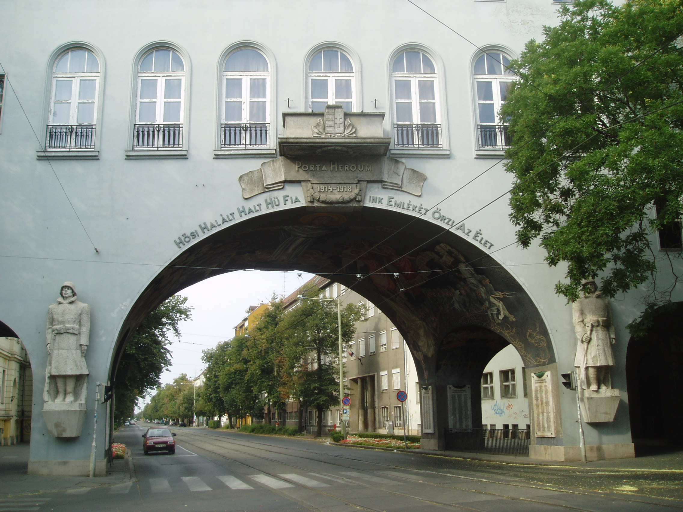 Nyilvános 1414 | 3685 | Szeged, Aradi vértanúk tere: Hősök kapuja | Az Aradi vértanúk tere déli oldalát a nagyszabású Hősök kapuja (Porta heroum) határolja. Az 1936-ban Pogány Móric tervei szerint épült kapu épült kapu honvédszobrai - az élő és a halott katona - Lőte Éva 1937-ben készült alkotásai, s az I. világháború áldozataira emlékeztetnek. A boltív freskóit Aba-Novák Vilmos készítette. A festményeket 1949-ben levakolták, csak a Millenniumra sikerült feltárni és helyreállítani őket. A művész a képsorozaton három témát jelenített meg: a háborús emlékezést, a hősi halottak dicsőítését és Horthy Miklós elindulását Szegedről. Középen, fejjel a tér felé Aba-Novák az ítélkező Krisztus mintegy 8 méteres alakját ábrázolta, lábainál a harsonás, ítélkező angyalok csoportjával. A kapu alatt kezdődik a nagyállomásra vezető Boldogasszony sugárút. A fénykép 2007 júliusában készült. Felh. irod.: www.vendegvaro.hu |
