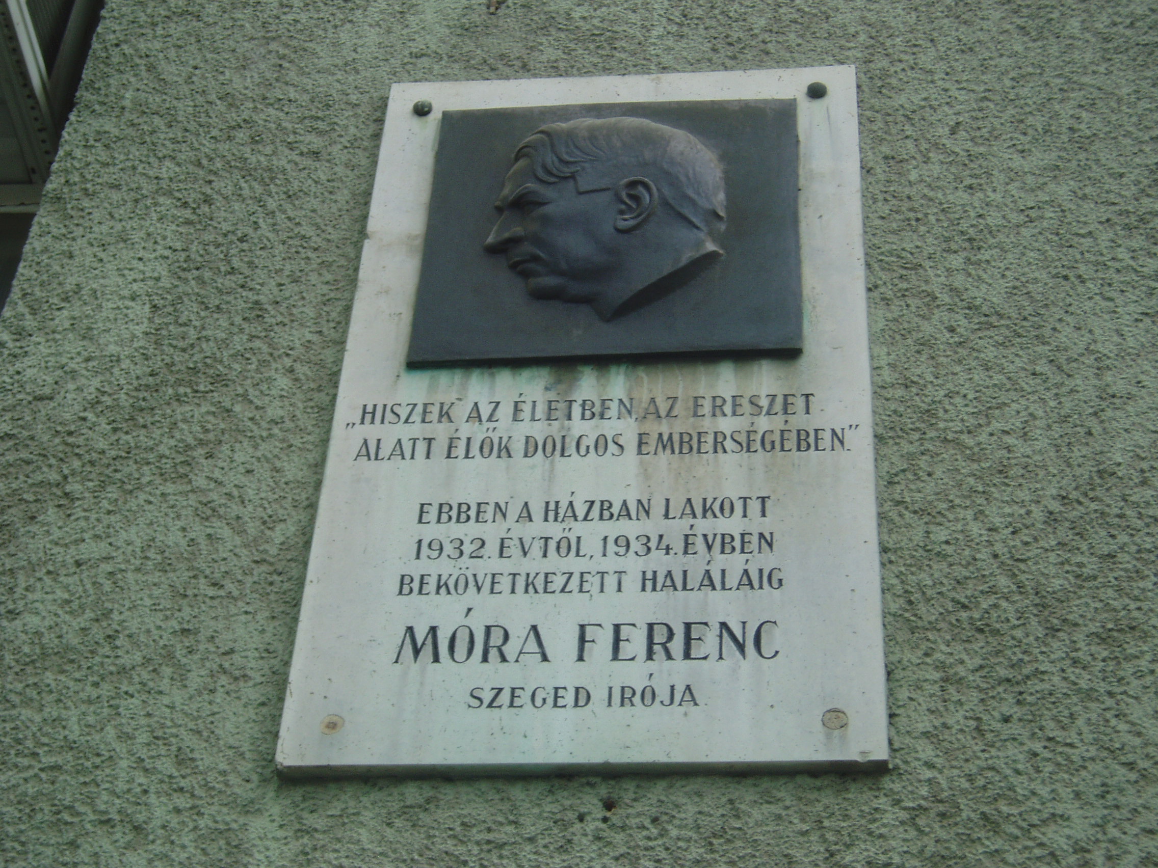 Nyilvános 1403 | 1881 | Szeged, Boldogasszony sugárút 15. | Az alaposan átalakított városi házban volt Móra Ferenc utolsó lakása. 1932-ben költözött ide a Kölcsey utca 10. szám alatti lakásából. Új otthonát csak rövid ideig élvezhette, rátört a súlyos betegség, a hasnyáálmirigyrák. Halála előtt két hónappal itt kereste fel őt az erdélyi írók küldöttsége: Tamási Áron, Bánffy Miklós, Kemény János, Kós Károly és Ligeti Ernő. 1934. január 20-án a szegedi ipartestület küldöttségét fogadta lakásában. A foltozó szűcs fia ekkor vallotta magát "nemzeti szolgálómesternek". 1934. február 8-án hunyt el, sírja a Belvárosi temetőben (lásd: Szeged, Fonógyári út) van. Az épületen lévő emléktábláját Tápay Antal készítette. A fénykép 2007 júliusában készült. Felh. irod.: Péter László: Szeged. Bp. Panoráma, 1981 |