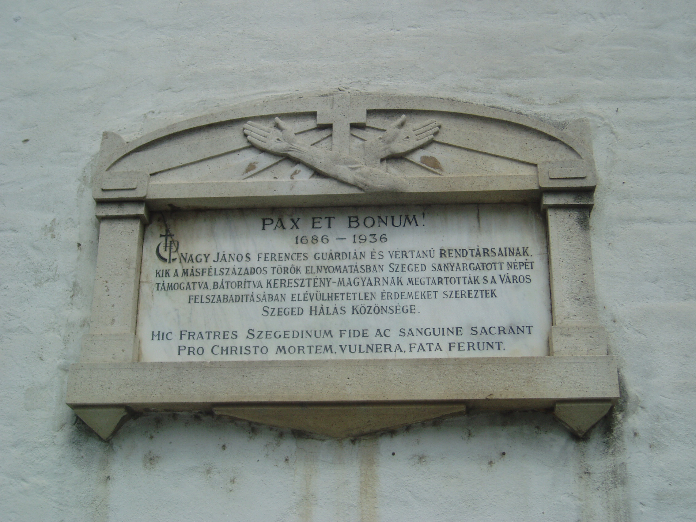 Nyilvános 1363 | 1733 | Szeged, Mátyás tér: Alsóvárosi templom | A templom és szerzetesei a török hódoltság idején nagy nemzeti, anyanyelvi hivatást teljesítettek mint a Délvidék magyar népének egyedüli lelkipásztorai. Ennek az időszaknak és név szerint Nagy János rendfőnöknek állítottak emléket a templom külső homlokzatán 1936-ban elhelyezett táblával. A fénykép 2007 júliusában készült. Felh. irod.: Bálint Sándor: A Szeged-alsóvárosi templom. Bp. Pannonia, 1966 |