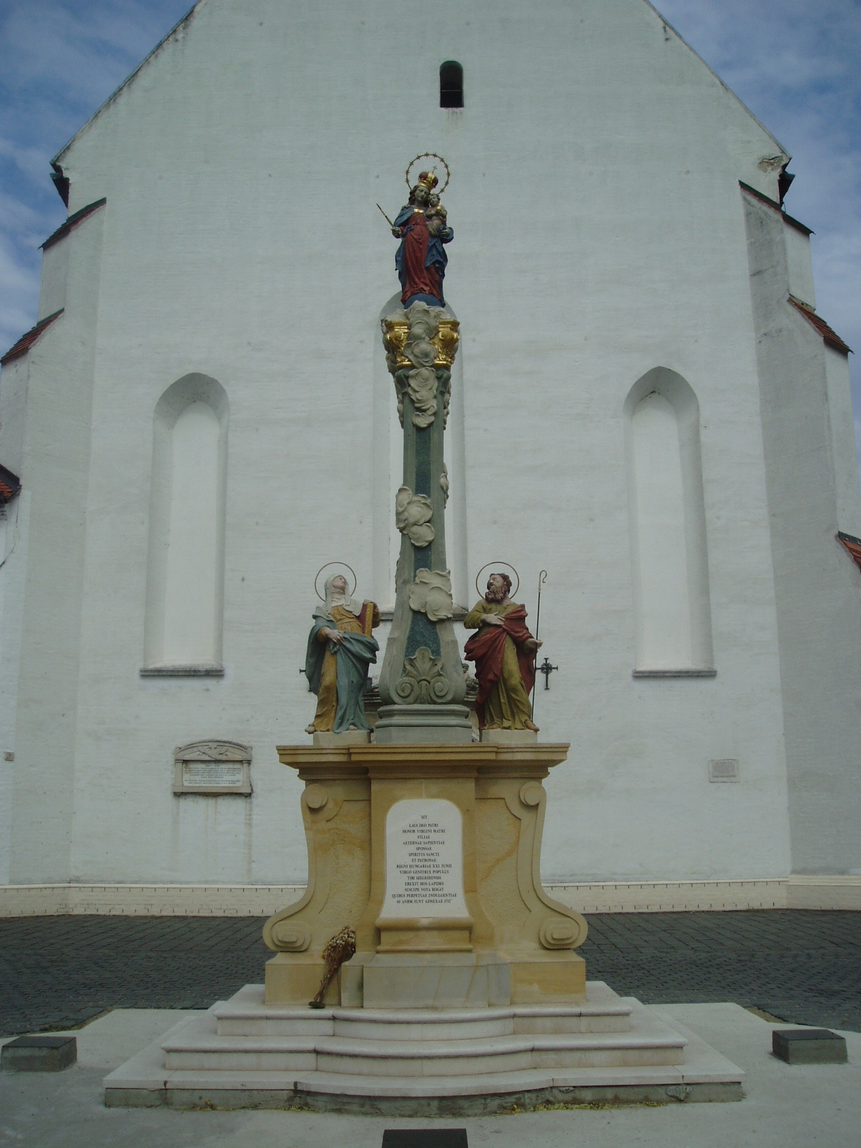 Nyilvános 1348 | 1788 | Szeged, Mátyás tér: Alsóvárosi templom | A gótikus Havi Boldogasszony-templom az Alföld egyik legnagyszerűbb középkori műemléke. A mellé épült kolostorral együtt 1444-től évszázadokon keresztül a ferencrendi barátok tulajdona volt. A templom a magyar késő gótikus templomépítészet egyik legérettebb alkotása. Főbejárata elé a közelmúltban került vissza a tönkrement, és darabjaiból restaurált Szeplőtelen Fogantatás-szobor (Mária-oszlop). Az ismeretlen mester által budai mészkőből faragott Mária-oszlopot eredetileg 1752-ben állították fel, Tóth József akkori szenátor jóvoltából. A legenda szerint egyszer egy idegen katona „Lássuk, a katolikusok istenasszonya képes-e magát megvédeni!“ – felkiáltással rálőtt a szoborra. El is találta Szűz Mária alakját, amelynek jobb karja letört – ezért nevezték akkoriban Csonka Szűznek –, de a golyó visszapattant, és halálra sebezte a férfit. 1948-ban, az akkor már igen rossz állapotban lévő, jégverés által is megrongált szobrokat lebontották, majd 1950-ben a ferences szerzetesek – attól tartva, hogy a kommunista hatóságok megsemmisítik a vallásos témájú kincseket – elásták a rendház istállójában. A kolostor felújításakor 1991-ben kerültek elő az elveszettnek hitt műkincsek. Rákos Péter restaurátorművész vezetésével újjávarázsolták a szoborcsoportot és 2006-ban felállították régi helyén. A fénykép 2007 júliusában készült. Felh. irod.: Péter László: Szeged. Bp. Panoráma, 1981 Bálint Sándor: A Szeged-alsóvárosi templom. Bp. Pannónia, 1966 Mezei András: Mária és társai újra a Mátyás térre kerülnek. = A Szeged-Alsóvárosi Ferences Plébánia Hírlevele 2006. 2. |