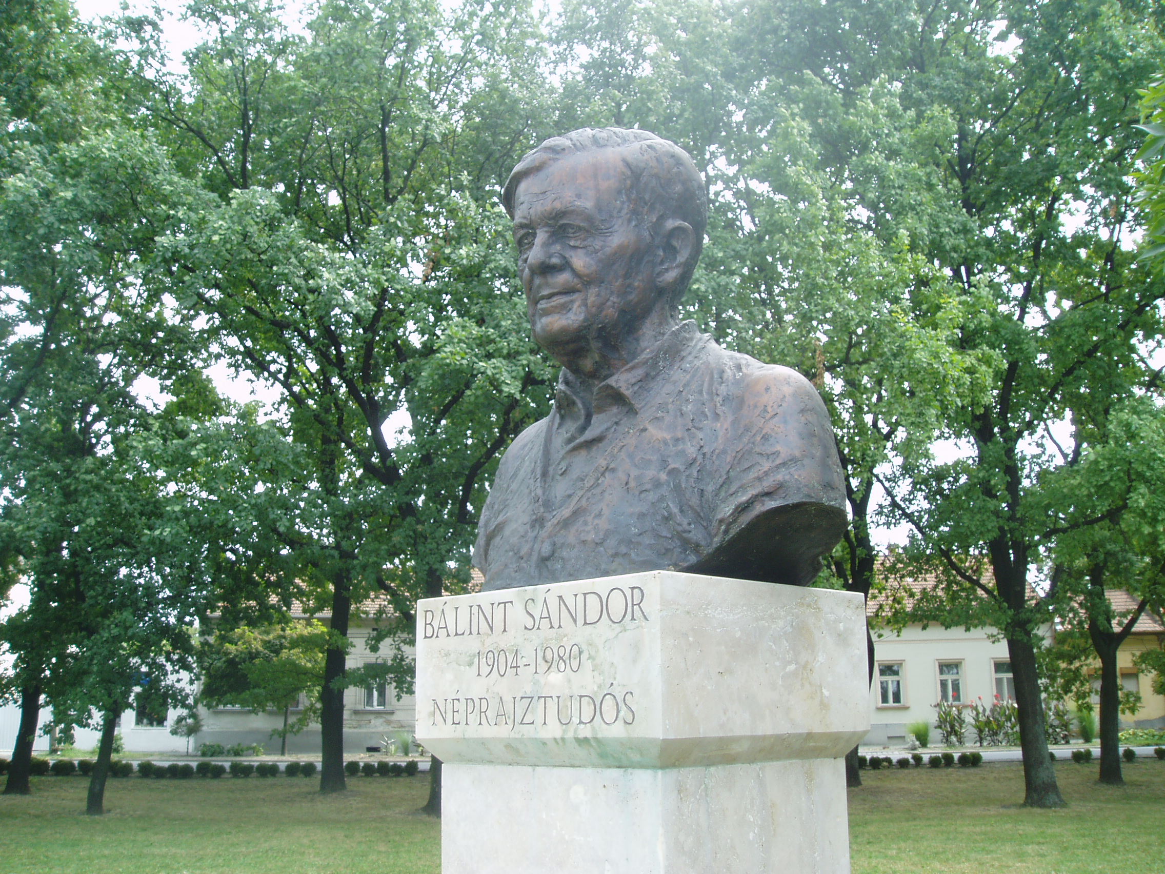 Nyilvános 1315 | 1806 | Szeged, Mátyás tér: Bálint Sándor szobra | Az Alsóvárosi templom közelében áll Bálint Sándor néprajztudós, "a legszögedibb szögedi" 1989-ben felavatott mellszobra, Kalmár Márton alkotása. Bálint Sándor 1904. augusztus 1-jén született az alsóvárosi Pálffy utcában. (Szülőházában Bálint Sándor Emlékház kialakítását tervezték, a házat azonban lebontották. Helyette kijelölték a közelben lévő Nyíl utca 43. számú épületet, ahol 2007 őszén már folyamatban van az emlékház kialakítása.) Az Alsóvárosi templomban keresztelték meg, s 1980-ban itt is ravatalozták fel. 1922-ben érettségizett a piaristáknál, majd a szegedi egyetemre iratkozott be. Az egyetem harmadik évfolyamát Pesten, majd a negyedik évfolyamot újra Szegeden végezte. 1937 és 1941 között a közelben működő Iskolanővérek tanítóképzőjében (lásd: Szeged, Szentháromság u. 70-76.) tanított, majd a szegei tudományegyetem tanára volt. Amikor egyik külföldi útjáról magával hozta Méray Tibor Nagy Imréről szóló könyvét, pert indítottak ellene, s „rendszerellenes izgatás” vádjával felfüggesztett börtönbüntetésre ítélték. 1966-ban kényszerű nyugdíjba vonult. Nyugdíjasként írta meg fő műveit, a Karácsony, húsvét, pünkösd (1973) és a Szögedi nemzet (1976) című monográfiáit. 1980-ban közúti baleset következtében hunyt el. Szegedi temetése a polgári értékrend melletti és a szocialista diktatúra elleni néma tüntetés volt. Az Alsóvárosi temetőben nyugszik. Munkássága két területen kiemelkedő: egyrészt Szeged és környéke, másrészt a népi vallásosság kutatásában. Tudományos munkásságát mintegy félezer közleménye, tanulmánya és könyve őrzi. A fénykép 2007 júliusában készült. Felh. irod.: "...szolgálatra ítéltél..." : Bálint Sándor emlékkönyv. Szeged, Lazi, 2004 Gelegonya Edina: Késik, de tavaszra meglesz a Bálint Sándor-emlékház. = www.delmagyar.hu/hirek |