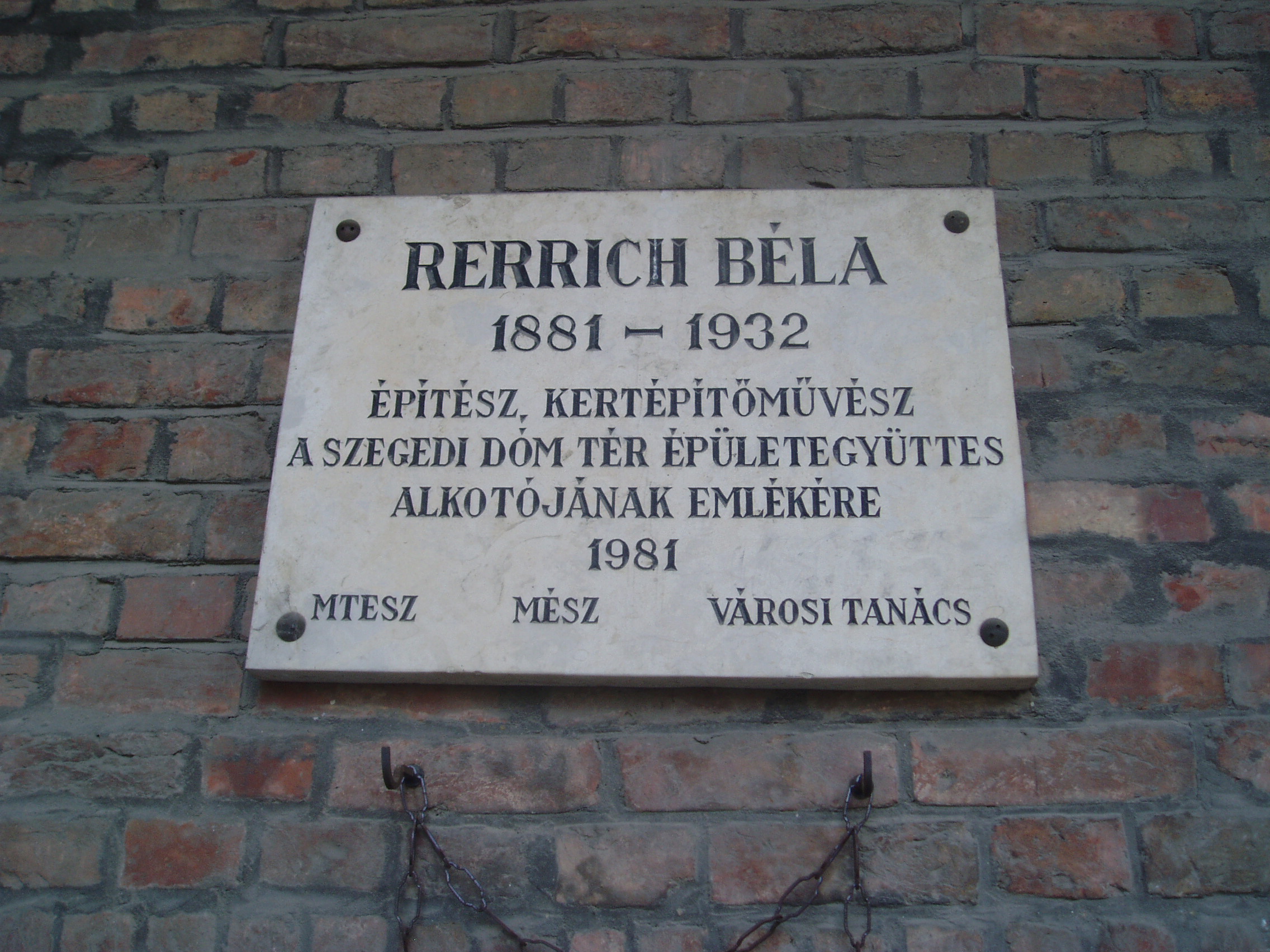 Nyilvános 927 | 1509 | Szeged, Rerrich tér: Rerrich Béla emléktáblája | A Fogadalmi templommal szinte összeforrott a két világháború közötti időszak legszebb magyar építészeti alkotása, a Rerrich Béla által tervezett árkádos épületcsoport, amely U alakban fogja össze a Bálint Sándor által legartisztikusabb hazai modern térkompozíciónak minősített Dóm teret. A Dóm építésével egyidejűleg merült fel az igény, hogy hangolják össze az egyetemi, illetve püspökségi épületeket. A tér megkomponálására Klebelsberg Kunó kultuszminiszter 1927-ben írt ki pályázatot, amelyet Rerrich Béla (1881-1932) nyert meg. Az épületegyüttes kialakítását 1928-ban kezdték meg. Az égetett, klinkertéglából készült téregyüttest az északeurópai országok építészete ihlette, Rerrich mintája valószínűleg a stockholmi városháza volt. Az épületegyüttes nyugati részein egyetemi kollégium és hittudományi főiskola, délnyugati részein püspöki székház, déli és keleti szárnyán pedig természettudományi és orvosi egyetemi intézetek foglalnak helyet. Rerrich Béla emlékére 1981-ben helyezték el a képen látható szöveges emléktáblát. Alakja domborműként is feltűnik azon az emléktáblán, amelyet a közelben a Dóm téri épületegyüttes kialakításában szerepet játszó személyiségeknek állítottak (lásd: Szeged, Rerrich tér: Dóm tér építési emléktábla). A fénykép 2007 júliusában készült. Felh. irod.: Péter László: Szeged. Bp. Panoráma, 1981 Bálint Sándor: Szeged városa. Bp. Képzőműv. Alap, 1959 |