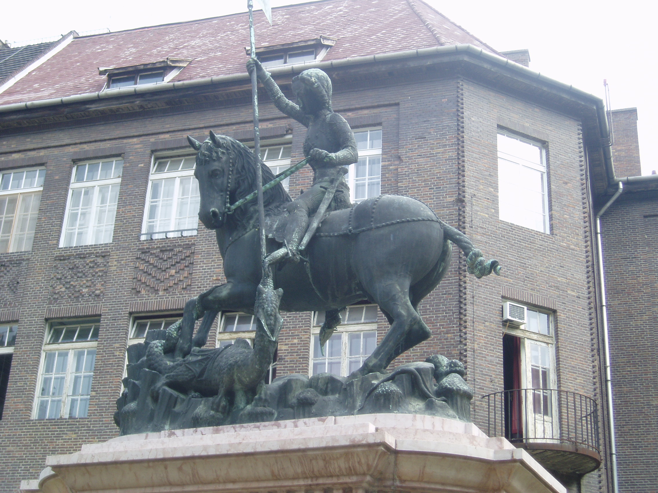 Nyilvános 1431 | 3388 | Szeged, Rerrich tér: Sárkányölő Szent György lovasszobra | A Dóm tőszomszédságában elhelyezkedő kis, intim hangulatú téren állították fel a Kolozsvári-testvérek 1373-ban készített, Szent Györgyöt ábrázoló lovasszobrának másolatát, amelyet Krausz Ferenc öntött 1938-ban Budapesten. A szobor, mely a városnak a nagyhírű kolozsvári egyetemhez való szellemi kötődését jelképezi, Klebelsberg Kunó kultuszminiszternek köszönhetően került Szegedre. Az eredeti műalkotás a prágai vár udvarán, a Hradzsinban látható. A fénykép 2007 júliusában készült. Felh. irod.: Péter László: Szeged. Bp. Panoráma, 1981 http://users.cwi.hu/idegenvezetes |