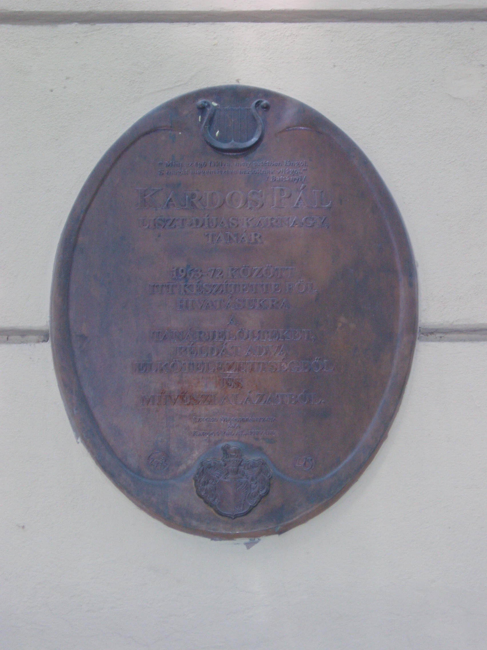 Nyilvános 1412 | 2004 | Szeged, Szentháromság utca 70-76. | Az egyházi Karolina Iskola épületében az elmúlt rendszer idején a Juhász Gyula Tanárképző Főiskola Ének–zene Tanszéke működött. Itt tanított Kardos Pál Liszt–díjas karnagy, aki 1961–1972 között a főiskola leánykarát is vezette. Kardos Pál tanári személyisége, művészi igényessége meghatározóvá vált növendékei és kollégái körében. Emléktábláját 2002. március 22-én avatták fel az épület falán. Az épületen portrédomborműves emléktábla idézi Bálint Sándor néprajztudós (1904–1980), „a legszögedibb szögedi” alakját, aki 1937 és 1941 között az itt működő Iskolanővérek tanítóképzőjének tanára volt. A fénykép 2007 júliusában készült. Felh. irod.: Tizenkét év kőben és ércben. Szeged, Önkormányzat, 2002 |