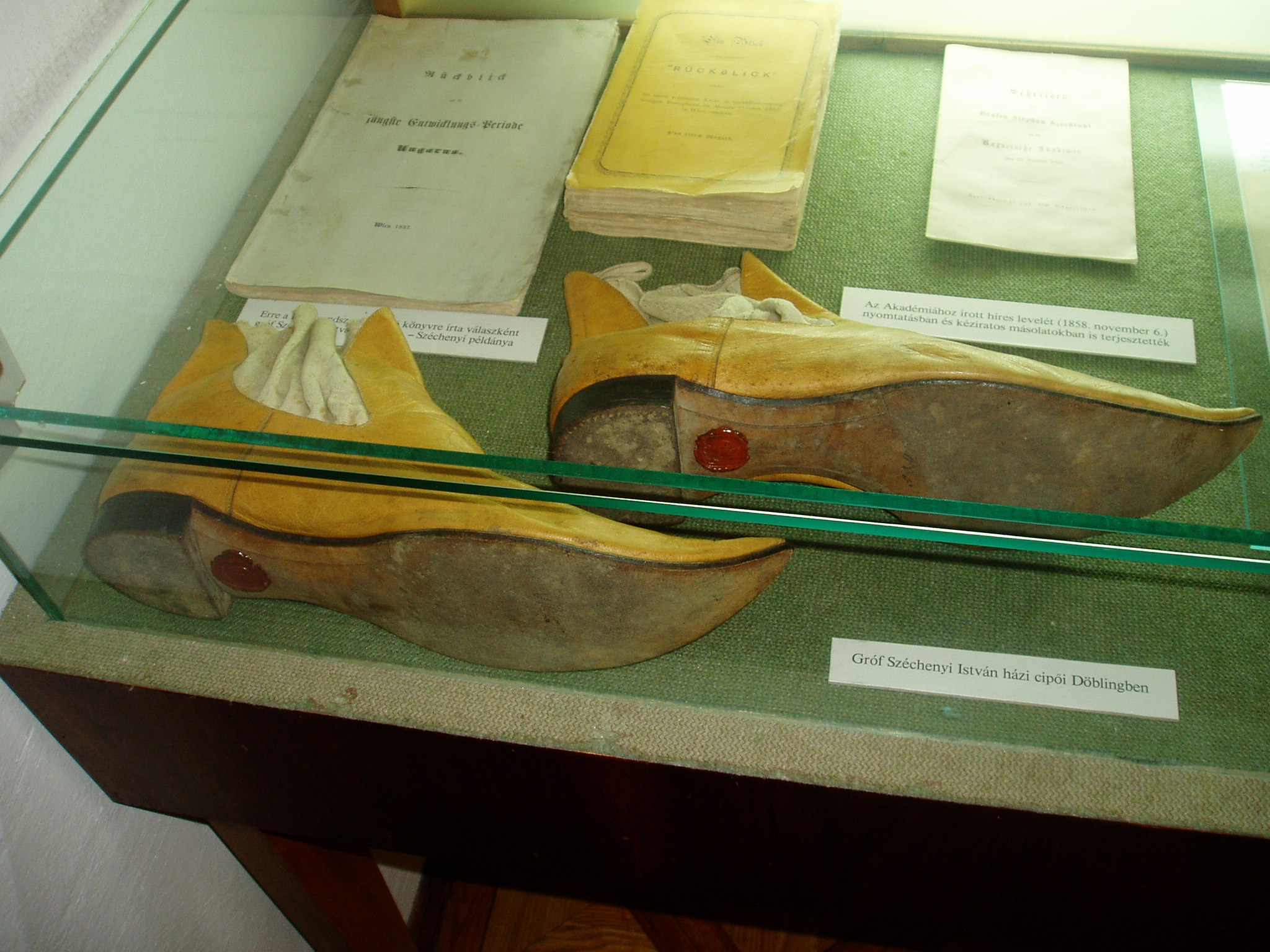 Nyilvános 1534 | 2394 | Nagycenk, Széchenyi-kastély | A barokk kastély építészeti szempontból is érdekes. Kiemelt jelentőségét azonban az adja, hogy itt élt a "legnagyobb magyarként" tisztelt Széchenyi István. A kastély ma emlékmúzeum. Az előcsarnok márvány mozaikpadlója és kandallója a kastély eredeti értékei közé tartozik. Az alsó szinten az életutat követhetjük nyomon. Az egybenyíló termek sorában elhelyezett tárgyak közül több közvetlenül Széchenyi Istvánhoz kötődik, így dolgozószobájának bútorai és íróasztala. A képen látható virtinben helyezték el Széchenyi István Döblingben használt házicipőjét más relikviák társaságában. A fénykép 2005 júliusában készült. Felh. irod.: Látnivalók Győr-Moson-Sopron megyében. Miskolc, Well-PRess, 2000 |