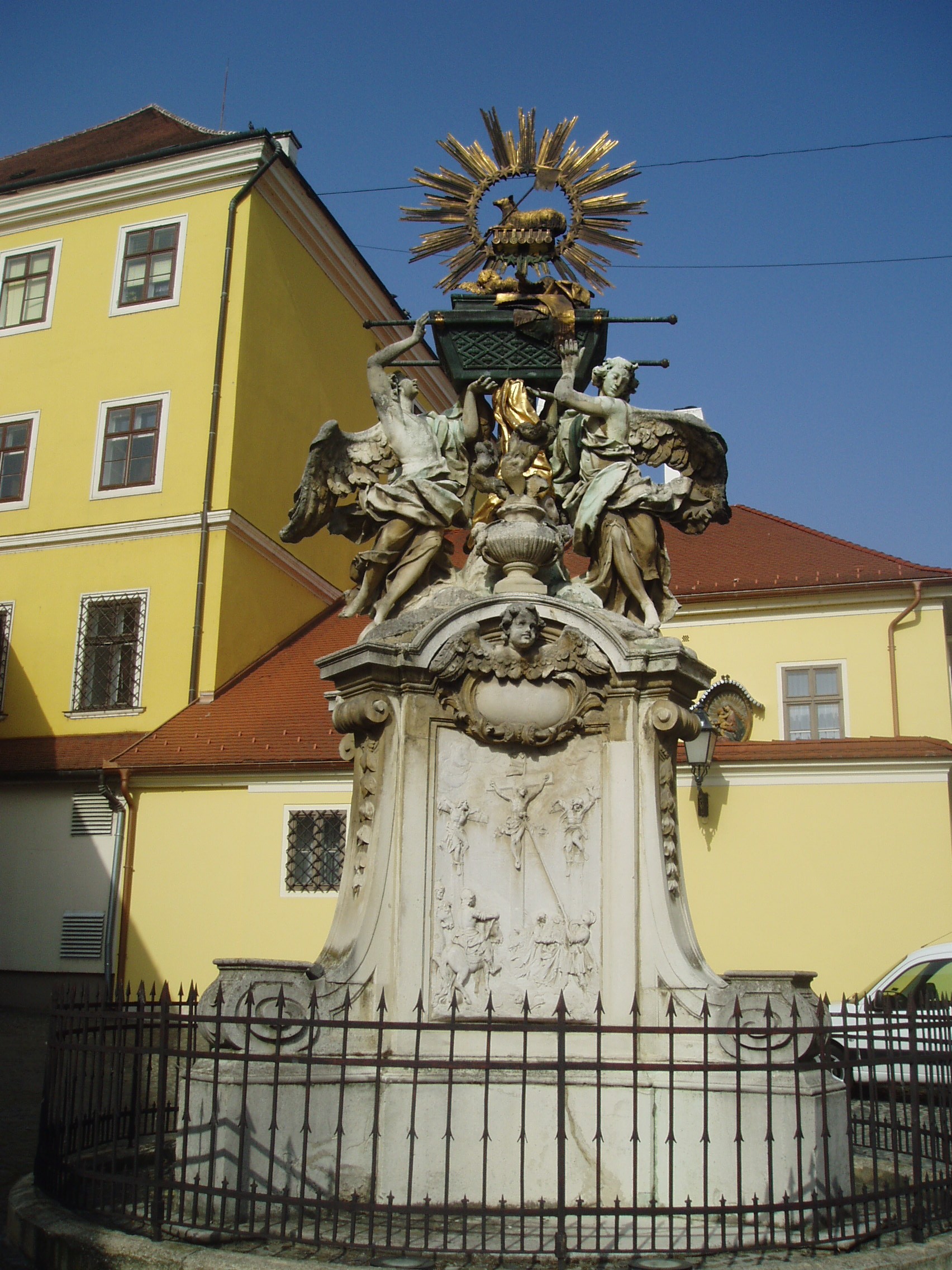 Nyilvános 1491 | 2452 | Győr, Gutenberg tér: Frigyláda | Az Apáca utca tengelyében, de már az olaszos hangulatú kis Gutenberg téren áll a nevezetes Frigyláda szoborcsoport, mely országos viszonylatban is korának egyik legkiemelkedőbb, barokk stílusú műalkotása. Magas alapzaton két lebegő angyal fogja közre a Frigyládát. Felette a glóriával övezett Isten Báránya, az Agnus Dei látható. Alapzatának oldalait vallásos vonatkozású domborművek díszítik. Itteni felállításához egy legenda fűződik. Eszerint 1729-ben egy egyházi körmeneten ministránsruhát öltött egy szökött katona. A vár őrsége felismerte, le akarták fogni, s a dulakodás következtében kiütötték a pap kezéből a monstranciát, amely eltörött. A győri polgárok megbotránkoztak az eseten, s III. Károly király engesztelésként emeltette az esemény színhelyén az emlékművet. A felvétel 2008 május végén készült. Felh. irod.: Cziglényi László: Győr. Bp. Panoráma, 1981 |